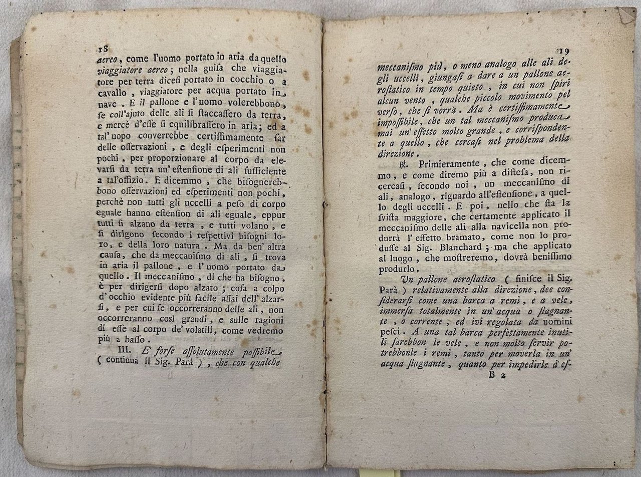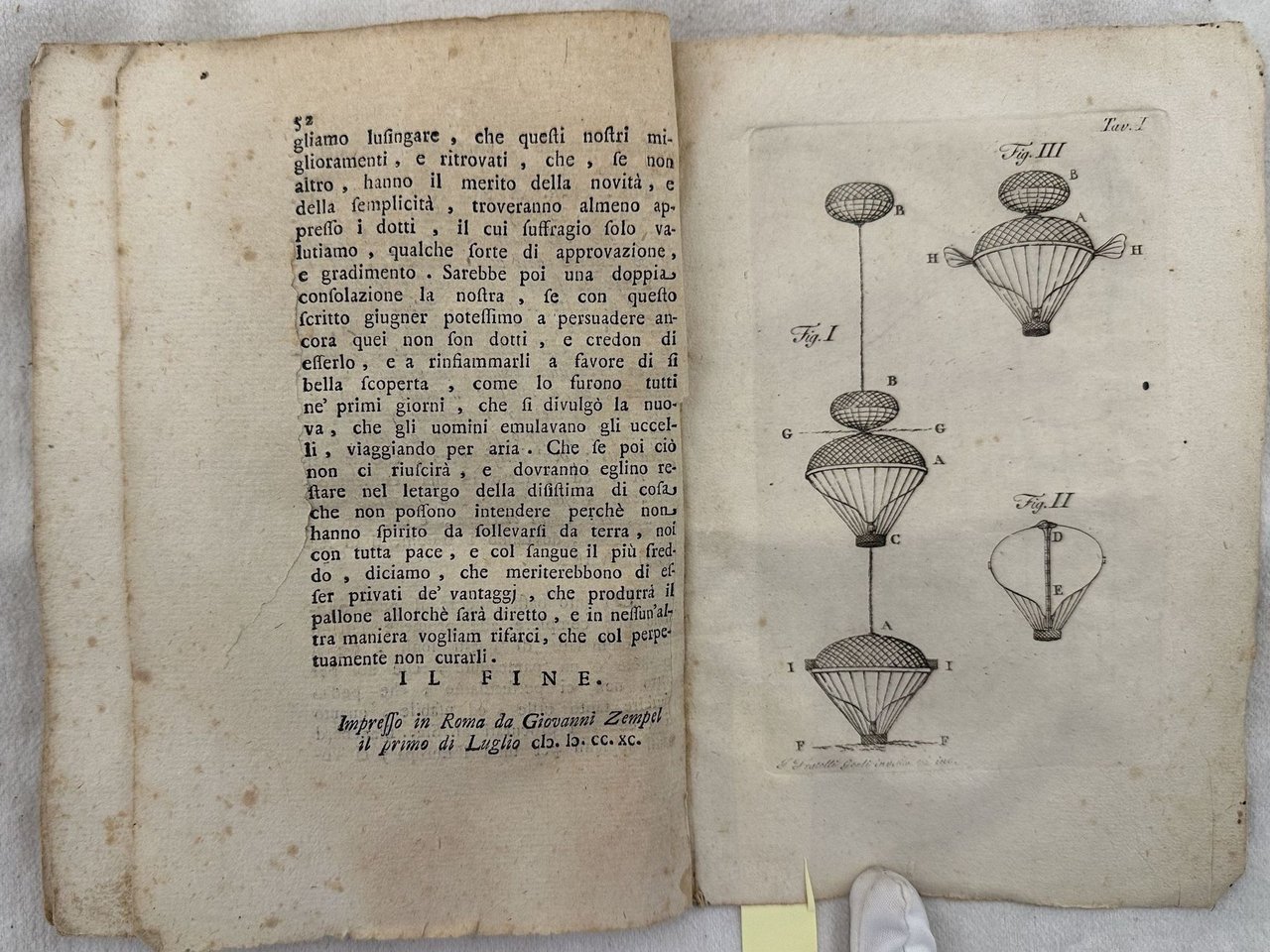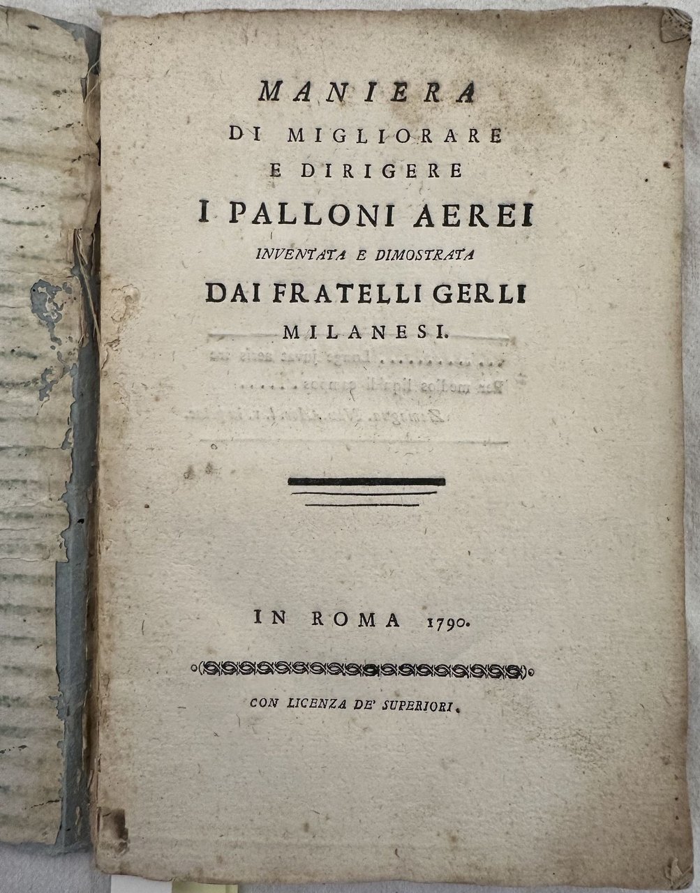 Rarissimo trattatto del 1790 sulla progettazione e miglioramento delle mongolfiere scritto dai fratelli Gerli. Nel 1784 i milanesi Carlo Giuseppe e Agostino Gerli su commissione del Conte Carlo Andreani costruirono la prima macchina aerostatica italiana sulla base di quella creata nel 1783 in Francia dai fratelli Montgolfier ma migliorandola notevolmente, tanto da renderla più simile alle moderne mongolfiere. "Il 19 genn. 1784, a Milano, alla presenza del ministro plenipotenziario conte J.J. von Wilczeck, i Gerli fecero innalzare un prototipo di palloncino che si elevò circa a un'altezza doppia della maggiore guglia del duomo. In seguito ai buoni risultati conseguiti venne intrapresa la costruzione dell'aerostato che avrebbe compiuto l'ascensione con uomini a bordo. Dopo 24 giorni di intenso lavoro, i tre fratelli realizzarono una mongolfiera costituita da un pallone del diametro di circa 21 m, costruito in tela internamente foderata di carta, con l'alloggio dell'equipaggio consistente in una grande cesta di vimini unita al pallone da un insieme di corde. Sotto la bocca del globo vi era un braciere, alimentato a legna imbevuta di un particolare bitume liquido, realizzato da Giuseppe. Dopo due infruttuosi tentativi, a mezzogiorno del 25 febbr. 1784, alla presenza di più di 2000 spettatori, la macchina aerostatica si innalzò presso la villa Andreani di Moncucco, nei dintorni di Brugherio, con a bordo il committente conte Paolo Andreani e i fratelli Gerli. Il pallone, dopo aver raggiunto l'altezza di circa 350 m, scese a un quarto di miglio dalla villa, in direzione di Monza. Dopo alcune modifiche all'apparecchiatura, fu tentato un secondo volo il 13 marzo dello stesso anno, con a bordo Andreani e due suoi dipendenti; il pallone, dopo un volo di 24 minuti, atterrò nelle vicinanze di Caponago (Opuscoli, pp. 1-17)." Nell'opera gli autori rendono noti i risultati dei loro studi di progettazione. Alla fine del volume due tavole ripiegate. In discrete condizioni e completo Copertina morbida decorata con rinforzo cartaceo al dorso in buone condizioni con lievi usure ai margini e dorso. Legatura in discrete condizioni con lievi rotture. Corpo del libro in parte staccato. Pagine in buone condizioni con fioriture. Piccolo strappo all'ultima carta che non lede il testo. In 8. 21x15 cm. Pp. 51+2 tav. Very scarce treaty of 1790 about construction and improving of hot air balloon written by brother Gerli. In 1784 Carlo Giuseppe e Agostino Gerli from Milan on behalf of Conte Carlo Andreani build the first italian aerostatic balloon based on that created in 1783 in France by the brothers Montgolfier but much improved, so much that it was similar to other hot air balloons. In the work they describes their work showing the results of their project. "Il 19 genn. 1784, a Milano, alla presenza del ministro plenipotenziario conte J.J. von Wilczeck, i Gerli fecero innalzare un prototipo di palloncino che si elevò circa a un'altezza doppia della maggiore guglia del duomo. In seguito ai buoni risultati conseguiti venne intrapresa la costruzione dell'aerostato che avrebbe compiuto l'ascensione con uomini a bordo. Dopo 24 giorni di intenso lavoro, i tre fratelli realizzarono una mongolfiera costituita da un pallone del diametro di circa 21 m, costruito in tela internamente foderata di carta, con l'alloggio dell'equipaggio consistente in una grande cesta di vimini unita al pallone da un insieme di corde. Sotto la bocca del globo vi era un braciere, alimentato a legna imbevuta di un particolare bitume liquido, realizzato da Giuseppe. Dopo due infruttuosi tentativi, a mezzogiorno del 25 febbr. 1784, alla presenza di più di 2000 spettatori, la macchina aerostatica si innalzò presso la villa Andreani di Moncucco, nei dintorni di Brugherio, con a bordo il committente conte Paolo Andreani e i fratelli Gerli. Il pallone, dopo aver raggiunto l'altezza di circa 350 m, scese a un quarto di miglio dalla villa, in direzione di Monza. Dopo alcune modifiche all'apparecchiatura, fu tentato un secondo volo il 13 marzo dello stesso anno, con a bordo Andreani e due suoi dipendenti; il pallone, dopo un volo di 24 minuti, atterrò nelle vicinanze di Caponago (Opuscoli, pp. 1-17)." At the end of the volume there are two foldd plates. In fair conditions and complete Soft decorated cover with paper reinforcement in the spine in good conditions lightly worn in the extremities. Binding in fair conditions with light cracks. The body of the book partially detached. Inside pages are in good conditions with foxing. Little tear in the last page not ruining the text. In 8. 21x15 cm. Pp. 51+2 tav.