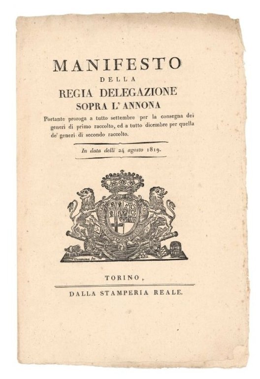 Manifesto della regia delegazione sopra l'annona Portante proroga a tutto settembre per la consegna dei generi di primo raccolto, ed a tutto dicembre per quella de' generi di secondo raccolto.