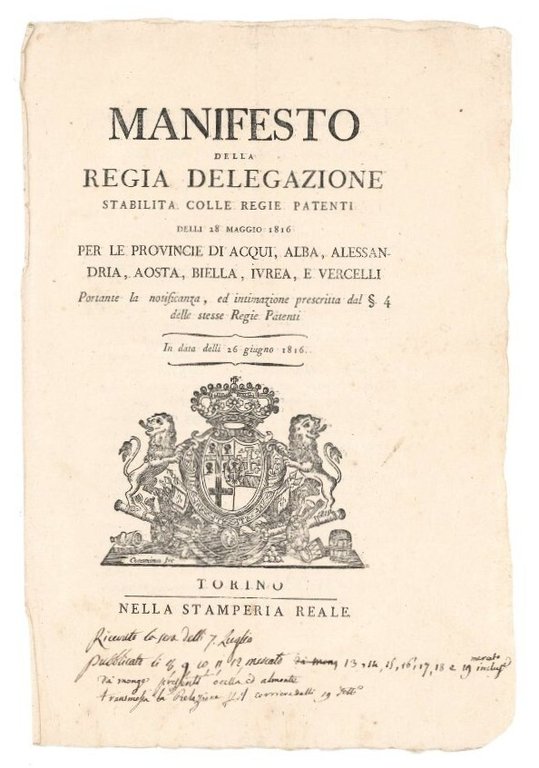 Manifesto della regia delegazione stabilita colle regie patenti [...] per le provincie di Acqui, Alba, Alessandria, Aosta, Biella, Ivrea, e Vercelli.