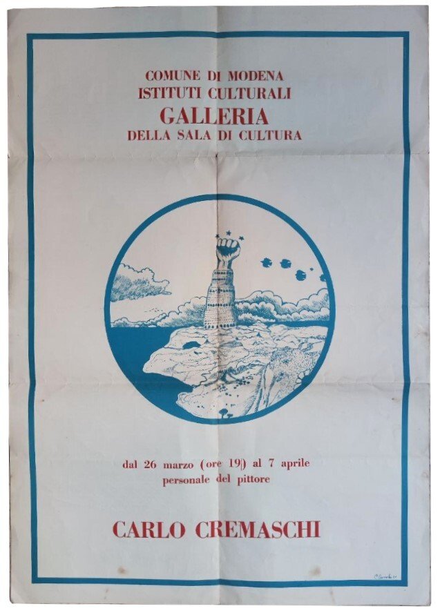 Mm. 620x434. Lievi fioriture e minime mancanze lungo le piegature. Manifesto per la mostra di Claudio Cremaschi tenutasi dal 26 marzo al 7 aprile 1966 con testi al verso di Claudio Parmiggiani, Adriano Spatola e Gian Pio Torricelli sul pittore. Al verso vi sono anche diversi schizzi a penna e a matita non identificati, ma attribuibili alla mano di Claudio Parmiggiani, che coprono in parte anche il testo a stampa. Raro