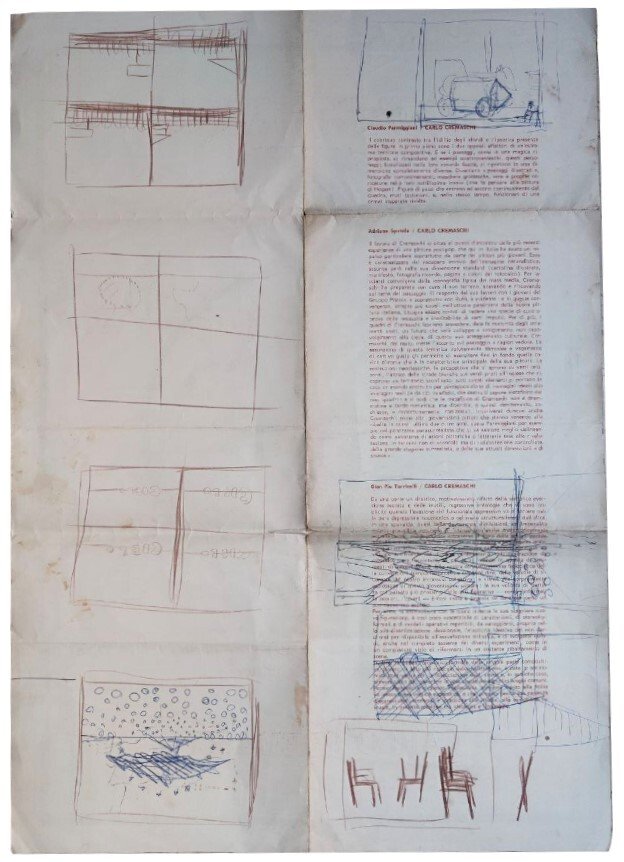 Manifesto per la mostra di Cremaschi alla Galleria della Sala di Cultura di Modena (con schizzi al verso probabilmente di mano di Carlo Parmiggiani)
