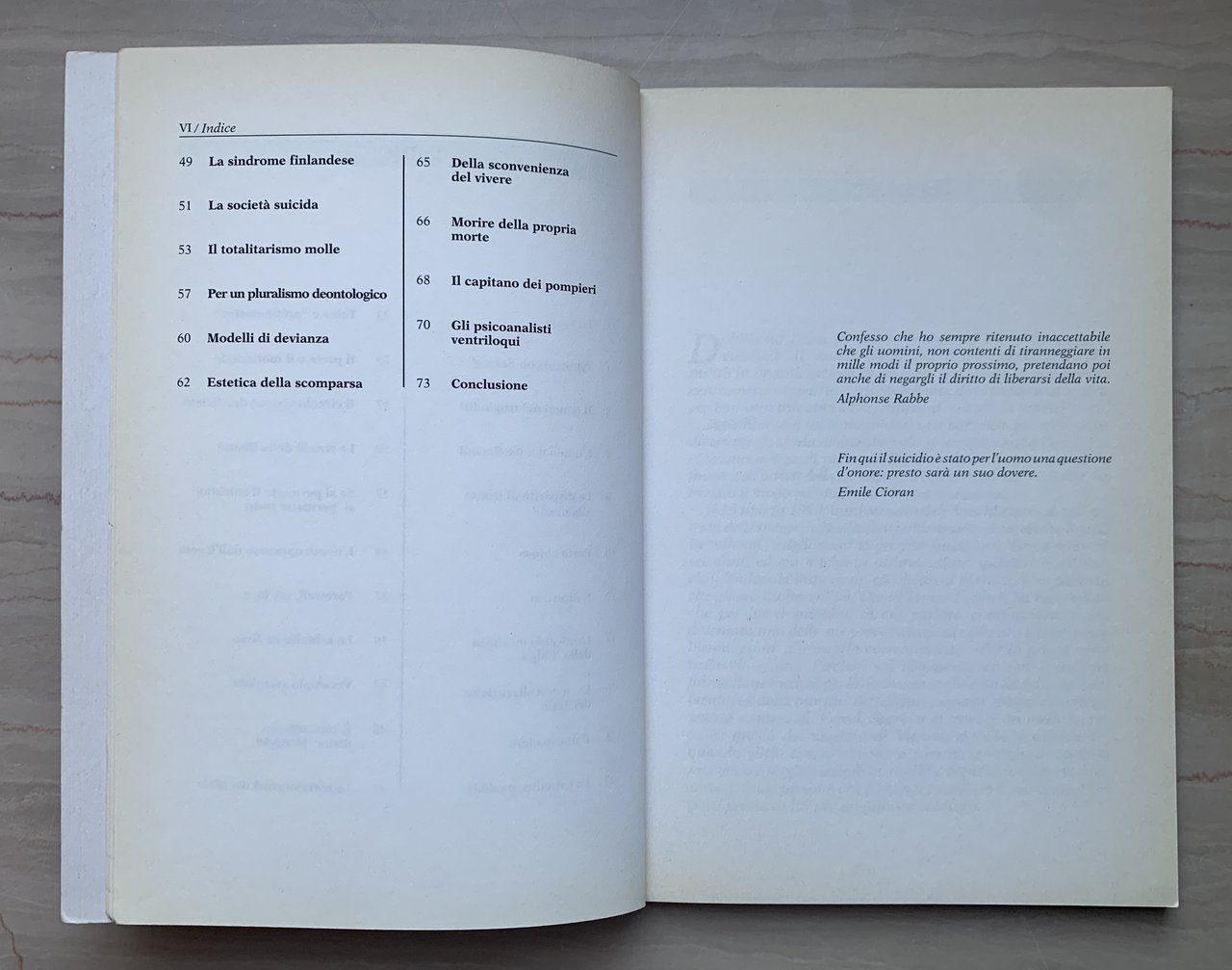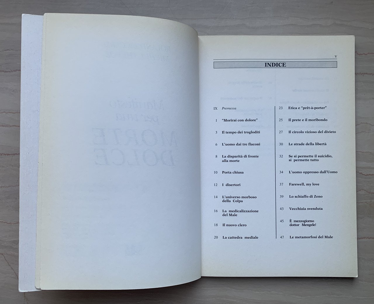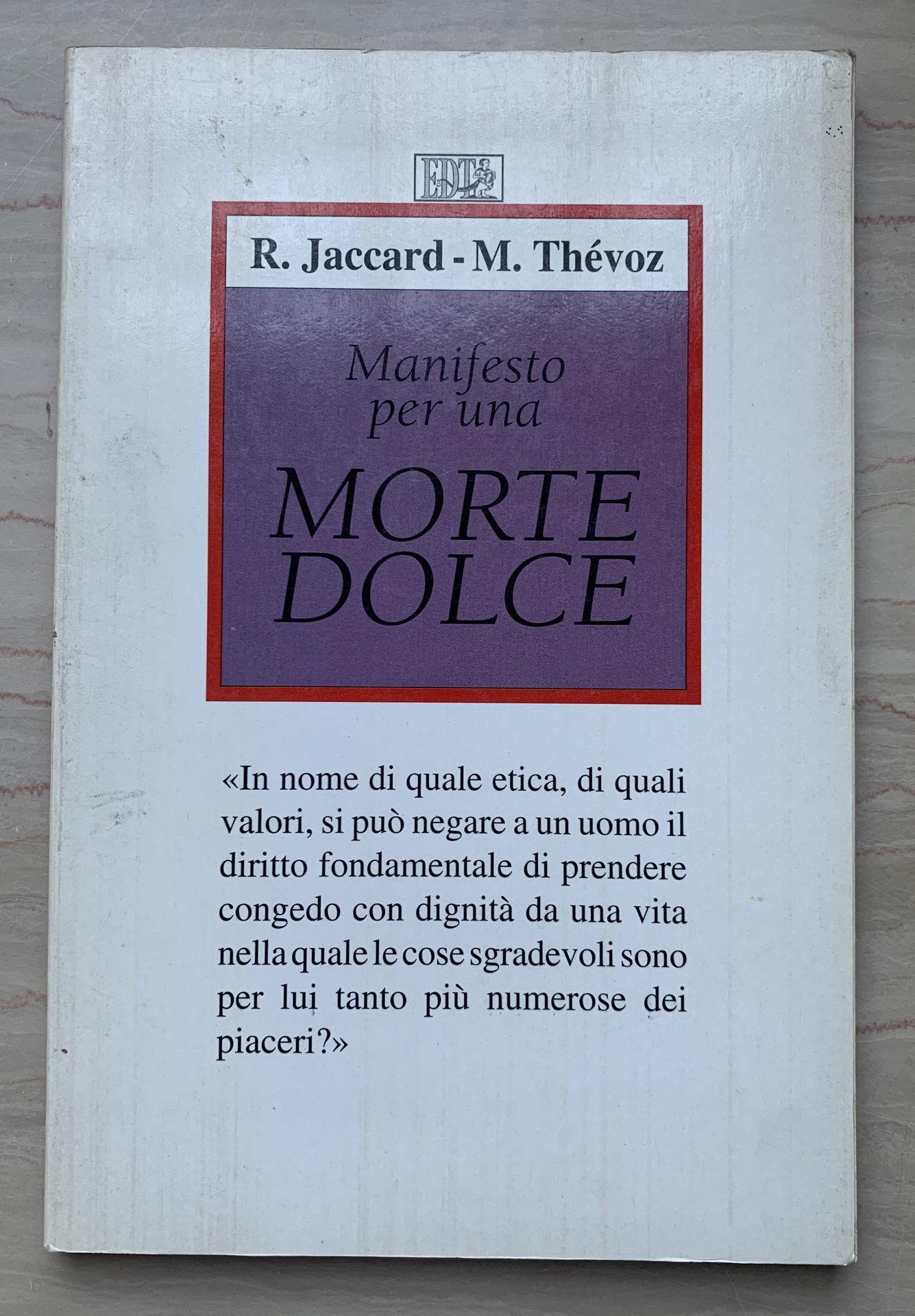 I ed. italiana: marzo 1993 (Titolo originale: Manifeste pour une mort douce © 1992 Édition Grasset & Fasquelle). Traduzione Milena Canonico. Collana diretta da Giorgio Bert L'Arte della Salute 15. VIII/XII+84=96/brossura patinata (Grafica di copertina: Marco Rostagno). Impaginazione: Alessandra Bianco. Stato buono (volume nel complesso leggermente brunito - copertina polverosa).