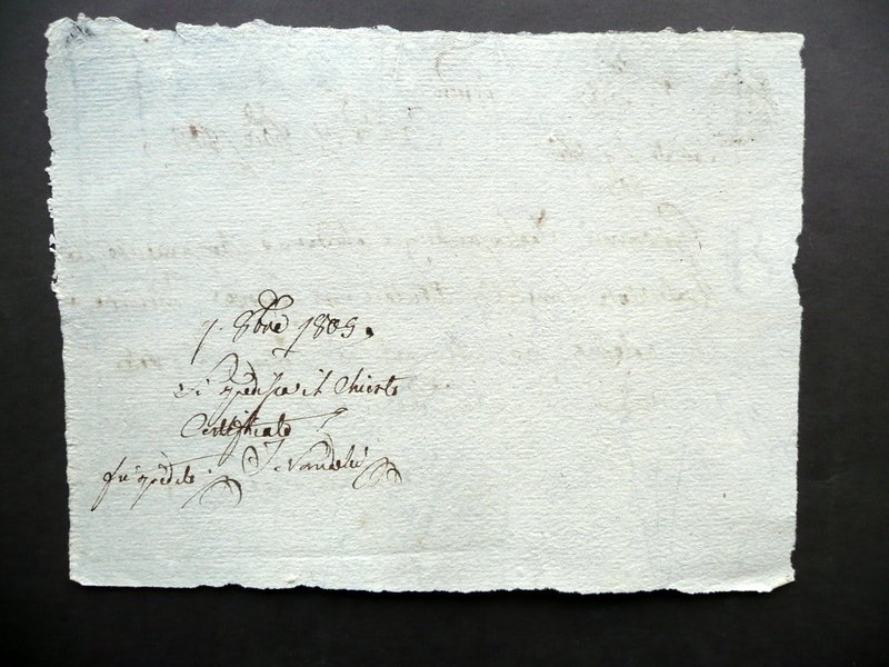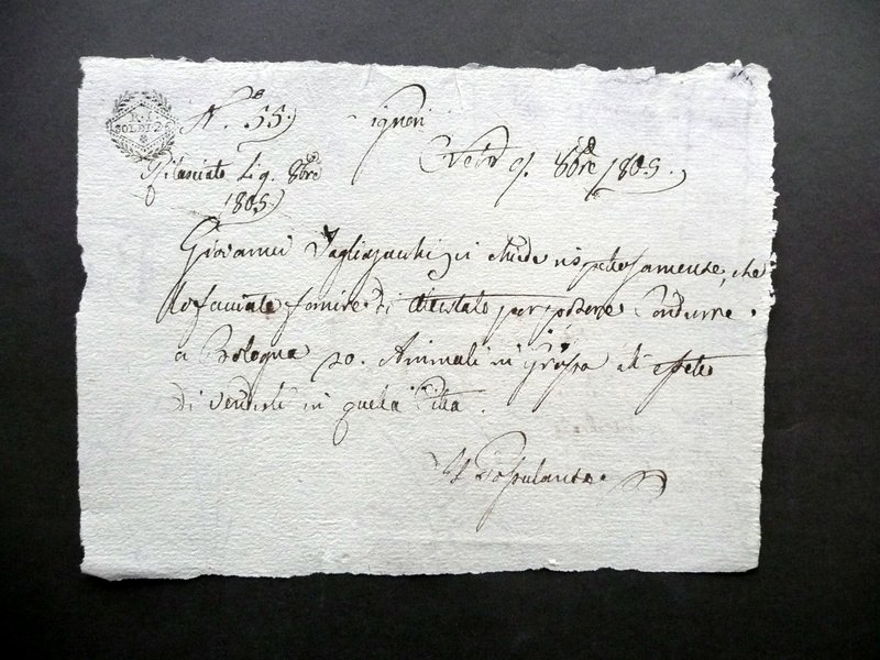 Attestato - richiesta manoscritta, Richiesta - attestato Di conduzione di 20 animali a Bologna A scopo di vendita Datato Castelvetro (Provincia di Modena), 9 ottobre 1805 Attestato - richiesta manoscritta su foglio in carta, datata 1805; testo disposto ad un unico lato; ad un angolo sup. e al retro sono presenti rispettivamente un timbretto e una nota d'epoca che ne certificano la validità (vedi foto). Cm 15x20. Condizioni di conservazione Esemplare ben conservato con tracce d'uso, poche pressoché trascurabili bruniture; margini ala forma. SC03.D12321 N