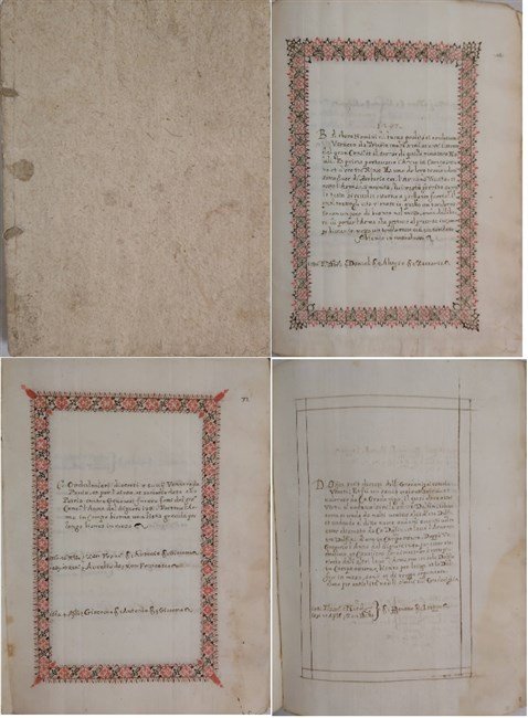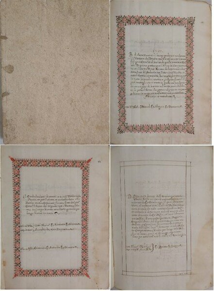 ms cartaceo in-8 (mm. 200x345), pagine numerate 92, pagine non numerate 83, leg. cart. rust. coevo. Il manoscritto contiene in ordine alfabetico i nomi delle nobili famiglie veneziane con annotazioni storiche sulle origini e provenienza e notizie caratterizzanti, comprendenti anche giudizi morali: "Avanzaghi vennero da Mantova.", "Basegio antichi Veneti di poche parole.", "Diedo gagliardi.", "Foscolo benevoli.", "Foscarini ellemosinari et mansueti.". Per ciascuna famiglia è descritto lo stemma araldico, sono ricordati i nomi dei rappresentanti più celebri e dei fatti più memorabili, con le date che vanno dalla metà del Cinquecento e non superano il primo decennio del Seicento. Il testo della prima parte, le cui pagine sono numerate, è contornato da elegante fregio a inchiostro nero e rosso, stilisticamente sempre diverso. Nella seconda parte il testo è contornato da semplice doppia cornice preparatoria per la decorazione. Occasionalmente compaiono alcune righe di integrazione di testo con calligrafia diversa. Mancano alcune pagine nella prima parte (p.55/56, pp. da 81 a 88). Al margine bianco inferiore destro è riportata la lettera per la rubricatura. Numerosi rinforzi marginali frutto di antico restauro. Vistose gore sulle ultime cc, e in particolare ultima pagina strappata. Affascinante manoscritto in barbe, con notizie molto interessanti sulla classe gentilizia veneziana tra Cinquecento e Seicento. [232]