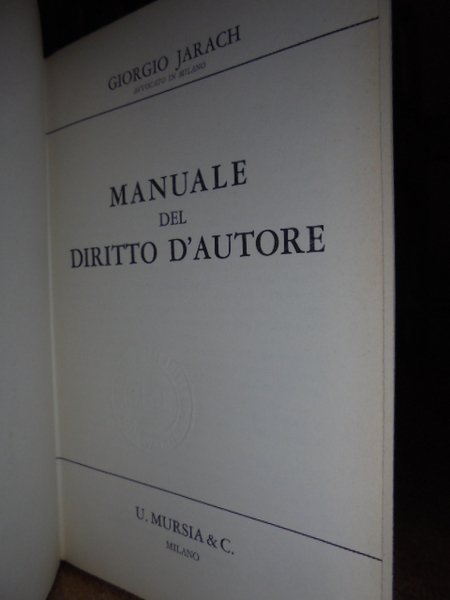 Giorgio Jarach - Milano, U. Mursia & C., 1968. Manuale del Diritto d' Autore. In-8°, cartonato con sovracopertina, 461 pp. In ottimo stato di conservazione. Neg. lett. mod. mob. H