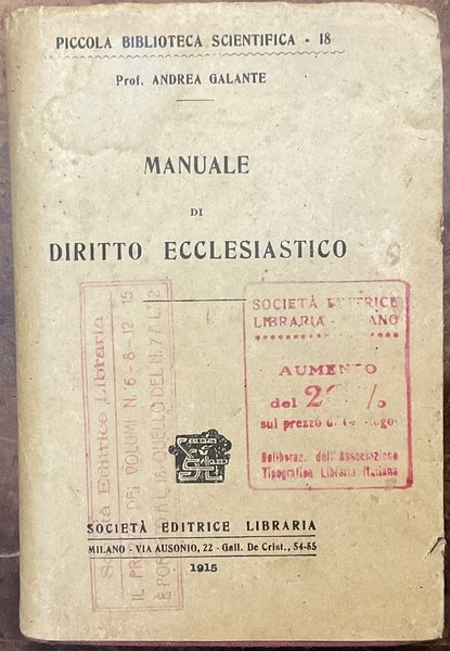 Molto buono, t. tela, sovrac., 13.5 cm, xvi+689 pp, MANCA L’ULTIMA PAG. DELL’INDICE ALFABETICO (Q-Z), macchioline e timbri alla sovrac. e alla tela. Alla sovrac. È indicato l’anno 1915, ma la data di pubblicazione è 1914