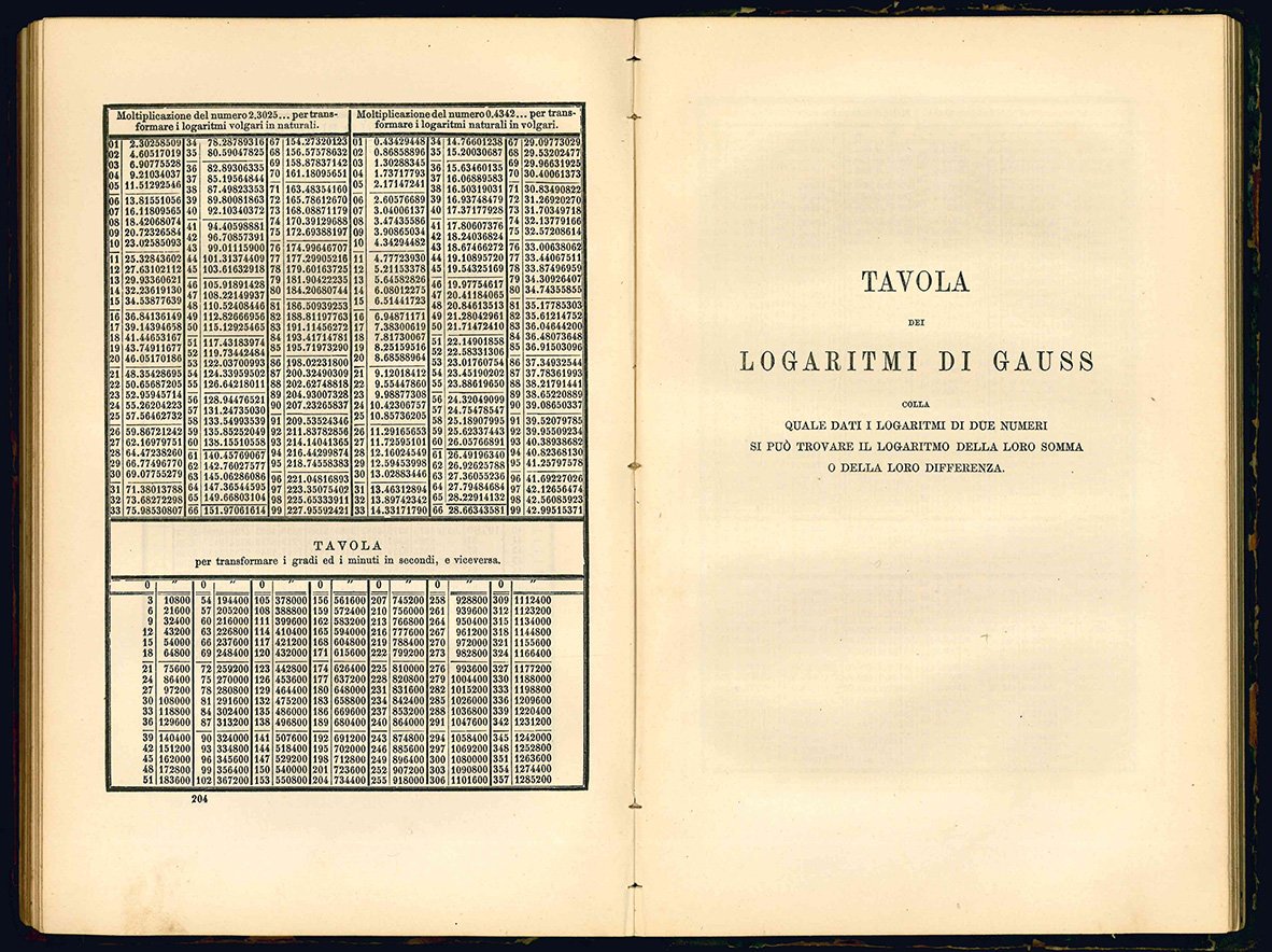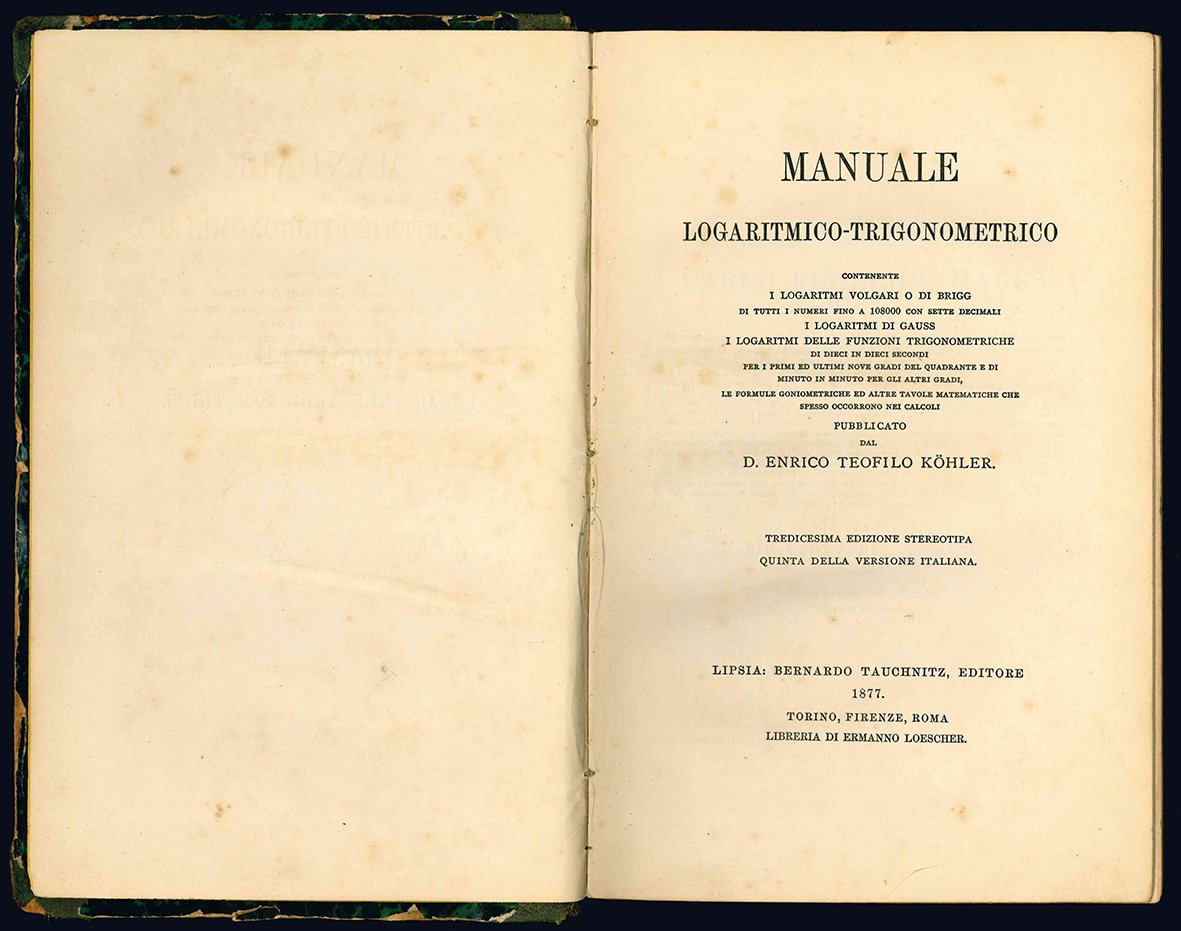 Manuale logaritmico-trigonometrico contente i logaritmi volgari o di Brigg di tutti i numeri fino a 108000 con sette decimali, i logaritmi di Gauss, i logaritmi delle funzioni trigonometriche di dieci in dieci secondi per i primi ed ultimi nove gradi del quadrante e di minuto in minuto per gli altri gradi, le formule goniometriche ed altre tavole matematiche che spesso occorrono nei calcoli. Tredicesima edizione stereotipa. Quinta della versione italiana.
