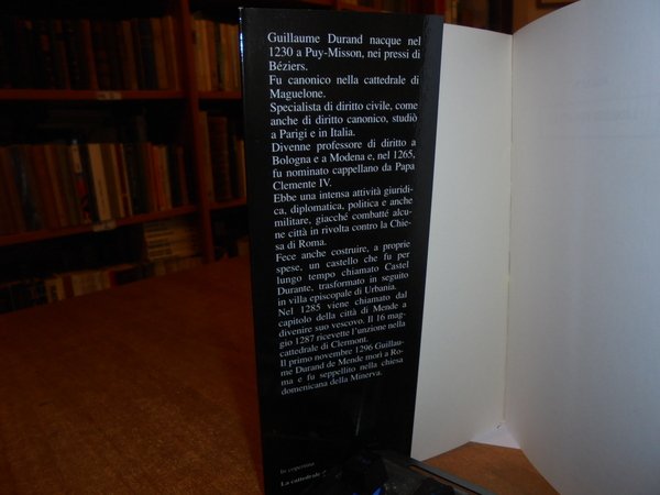 GUILLAUME DURAND de MENDE. Roma, Edizioni Arkeios, 1999. Manuale per comprendere il significato simbolico delle cattedrali e delle chiese. In-8°, cart. edit. con risvolti. 126 pp. Come nuovo. Uff. stanzetta mob. piccolo a destra