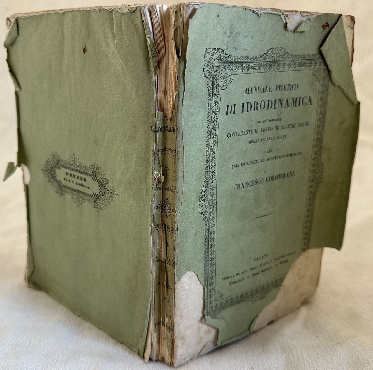 Edizione del 1842 di questo manuale di idrodinamica scritto da F. Colombani ad uso degli ingegneri ed agenti di campagna. Appendice contenente il testo di alcune leggi relative alle acque. All'interno: Estrazione dell'acqua da unr ecipiente, Sorgenti, Condotta dell'acqua, Uso dell'acqua come forza motrice, irrigazione, Dal codice civile austriaco ecc. Alla fine è presente una tavola ripiegata. In discrete condizioni. Copertina editoriale in discrete condizioni generali con lievi usure e mancanze ai margini e dorso. Legatura in discrete condizioni con lievi rotture. All'interno le pagine si presentano in buone condizioni con rare fioriture. Lievi gore d'umidità marginali. In 8. Dim. 22x15 cm. Pp. VIII+160+(12).Edition og 1842 of this manual of hydrodinamics written by F. Colombani for the usage of ingeneerings. Appendix witht he text of some laws about waters. A folded plate at the end In fair conditions. Editorial cover in fair general conditions lightly worn in the extremities. Binding in fair conditions with light cracks. Inside pages are in good conditions with occasional foxing. Dump stains int he edges. In 8. Dim. 22x15 cm. Pp. VIII+160+(12).