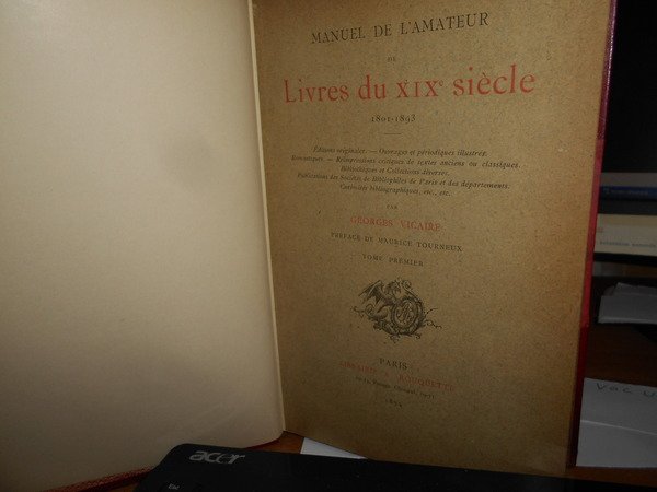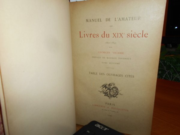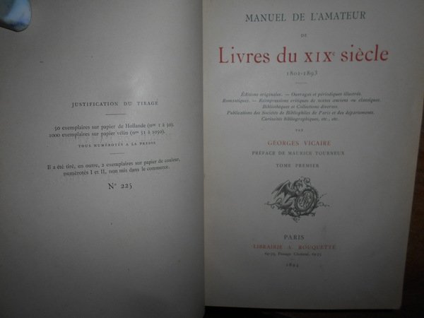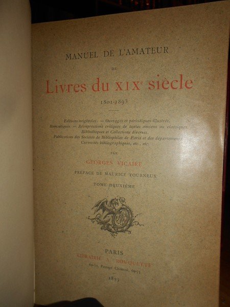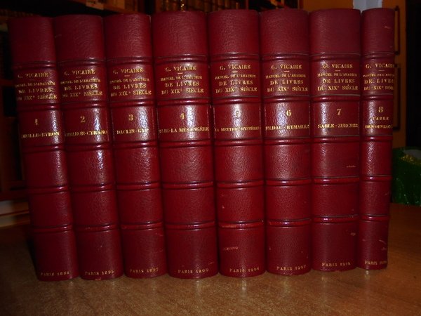 GEORGES, VICAIRE. Paris, Librairie A. Rouquette, 1894. 1920. MANUEL DE L' AMATEUR de Livres du XIX Siècle 1801-1893. MANUEL DE L' AMATEUR de Livres du XIX Siècle 1801-1893. Edition originale - Ouvrage et périodiques illustrés Romantiques - Réimpressions critiques de textes ancient ou classiques. 8 volumi in-8°, m. marocchino coevo con larghe punte, dorsi a 5 nervi con titoli e date in oro, copertine originali conservate, tagli marmorizzati. xix, 990 pp.; 1098 pp.; 1188 pp.; 1362 pp. 1324 pp.; 1240 pp.; 1232 pp.; 646 pp. (le pagine sono numerate per colonne). Magnifico esemplare in prima edizione. E' presente inoltre il volume ottavo che spesso manca. Edizione a tiratura limitata di 1000 esemplari. Uff. E III - 2