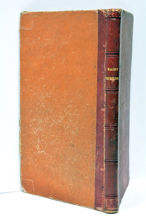 1 feuillet blanc. Frontispice. 1 feuillet. XXIV. 141 pages. 1 feuillet. 1 feuillet blanc. (19 x 11 Cm). Demi-maroquin rouge, dos lisse orné. Plats un peu frottés. Quelques petites déchirures sans manque dans le corps du texte, mais bon exemplaire par ailleurs. Assemblage d'écrits consacrés à Eutrope de Saintes par l'abbé Joseph Briand. Inclus dans ce livre se trouve une notice historique qui fit l'objet d'une publication séparée et qui a gardé sa page de titre dans le recueil. Rare livre imprimé à Saintes.