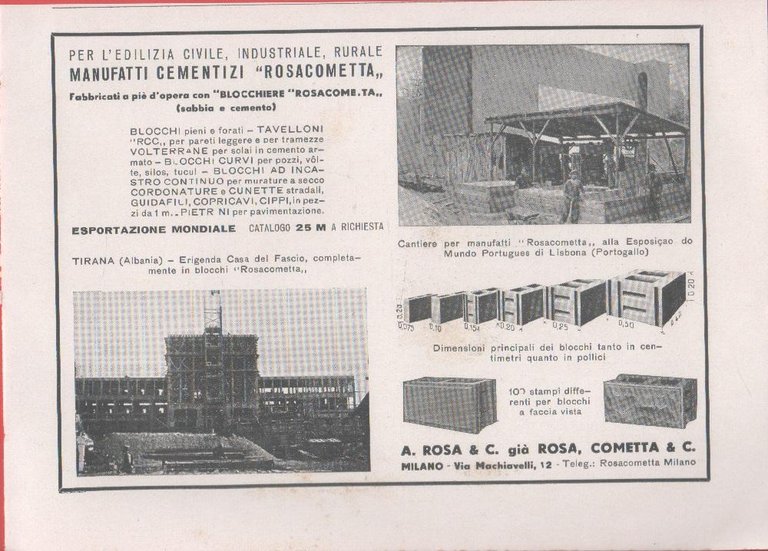 Manufatti cementizi Rosacometta. Pubblicità 1940