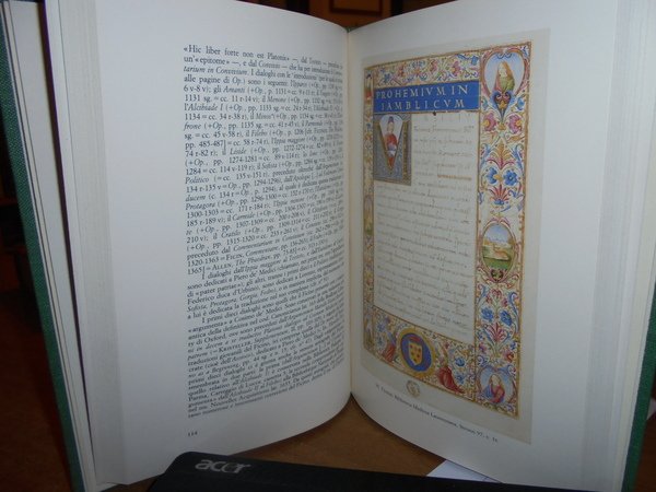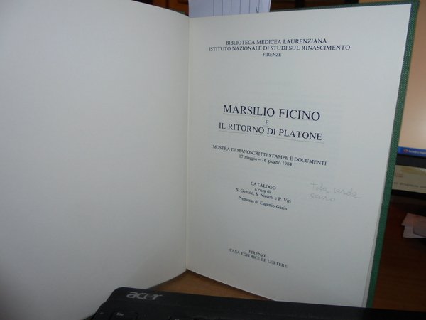 Catalogo a cura di S. Gentile, S. Niccoli e P. Viti. Premessa di Eugenio Garin. MARSILIO FICINO e il Ritorno di Platone. Mostra di Manoscritti Stampe e Documenti. 17 Maggio - 16 Giugno 1984. Firenze, Casa Editrice Le Lettere, 1984. In-8°, tutta tela verde scuro con titolo in oro entro tassello al dorso, copertine originali conservate. xiv, 212 pp. con tavole a colori f.t., in fine XXXIX tavole in bianco e nero f.t. Come nuovo in legatura recente. Uff. D - III - 6 - 2