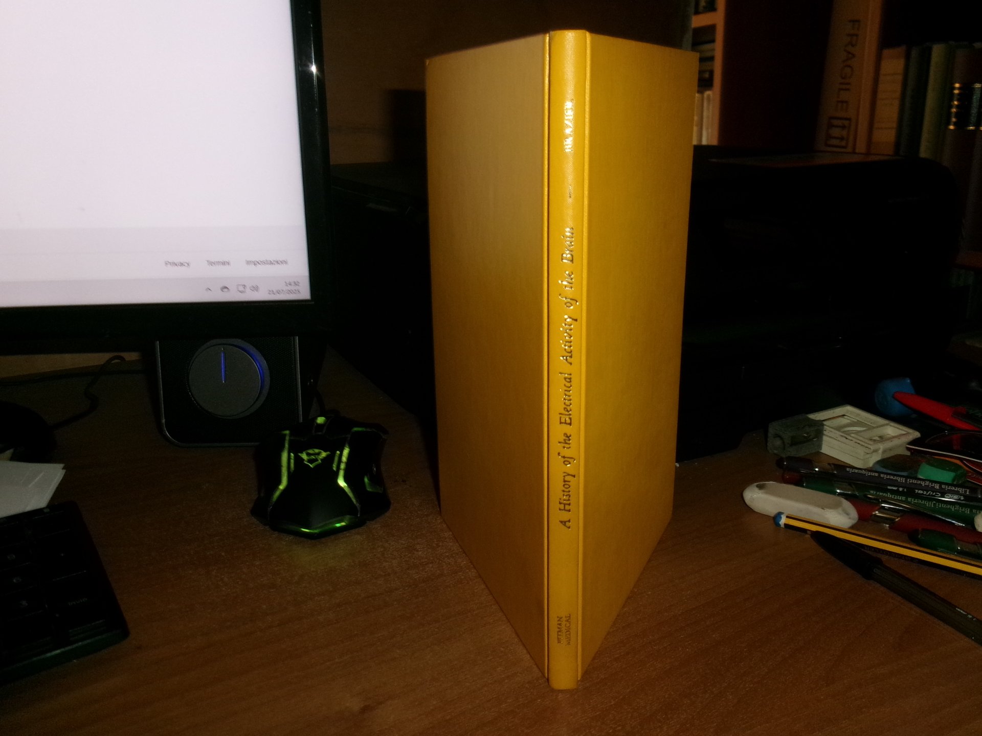 MARY A. B. BRAZIER. A History of the Electrical Activity of the Brain. London, Pitman Medical Publishing, 1961. In-8°, tela gialla edit. con titolo in oro al dorso. 119 pp. con numerose illustrazioni e ritratti in bianco e nero n.t. MARY A. B. BRAZIER. A History of the Electrical Activity of the Brain. London, Pitman Medical Publishing, 1961. In-8°, tela gialla edit. con titolo in oro al dorso. 119 pp. con numerose illustrazioni e ritratti in bianco e nero n.t. This book provides a historical account of the early developments and understanding of the electrical activity in the brain, focusing on the initial fifty years of research in this field. Come nuovo con testo in inglese. Neg. mob. rosso.