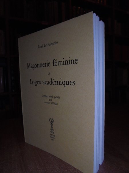 René Le Forestier. Milano, Archè, 1979. (Massoneria) Maçonnerie féminine et Loges académiques. Ouvrage inédit publié par Antoine Faivre. In-8°, cartoncino edit. XI, 252, (1) pp. con 2 illustrazioni n.t. Le livre de René Le Forestier (1868-1952) sur la Franc-Maçonnerie templière et occultiste connaît depuis dix ans, auprès du grand public cultivé et parmi les maçonnologues, un succès qui m'a encouragé à éditer le présent ouvrage. La biographie et l'oeuvre de cet historien, germaniste érudit et écrivain de talent, ont fait l'objet d'une présentation détaillée 2 à laquelle le lecteur se reportera aisément. Y suffit ici de préciser que le fonds Le Forestier, outre d'abondantes notes de lecture sur la Maçonnerie du XVIII ème siècle et le magnétisme animal, renferme deux travaux qui furent menés à leur terme, un seul avait été publié, c'est l'autre qui est présenté aujourd'hui. Par Maçonnerie « androgyne » (chapitres I à V) il faut entendre évidemment, comme l'explique l'auteur, les Loges d'Adoption, celles qui admettaient des femmes. Come nuovo. Neg. mass. mob. P