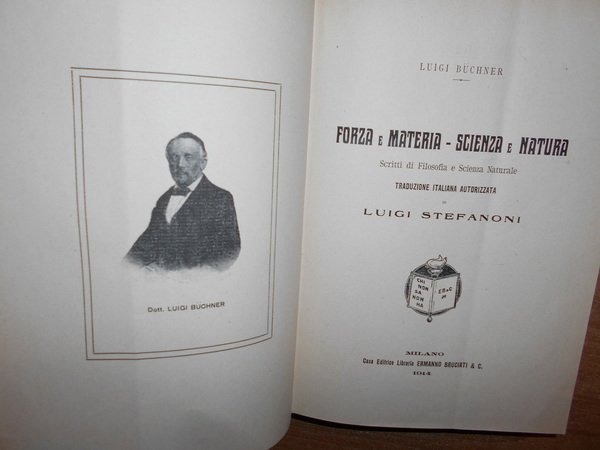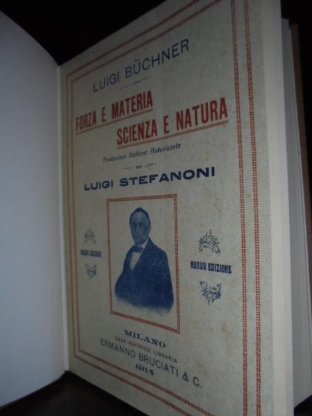 BUECHNER, Luigi. Milano, Ermanno Bruciati & C., 1914. Forza e materia - Scienza e natura. Scritti di filosofia e scienza naturale. In-8° grande, leg. nuova in tela bruna, copertine originali conservate. 525, (3) pp. Esemplare come nuovo. Uff. TV. mob. nostro