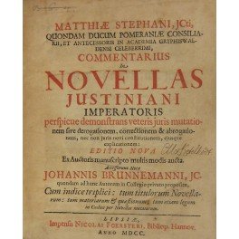 Matthiae Stephani . Commentarius in Novellas Justiniani Imperatoris perspique demonstrans veteris juris mutationem sive derogationem correctionem et abrogationem nec non juris novi constitutionem ejusque explicationem. Editio nova ex Auctoris manuscripto multis modis aucta. Accesserunt Notae Johannis Brunnemanni JC. quondam ad hunc Autorem in Collegio privato propositae. Cum indice triplici tum titulorum Novellarum tum materiarum et quaestionum tum etiam legum in Codice per Novellas mutatarum