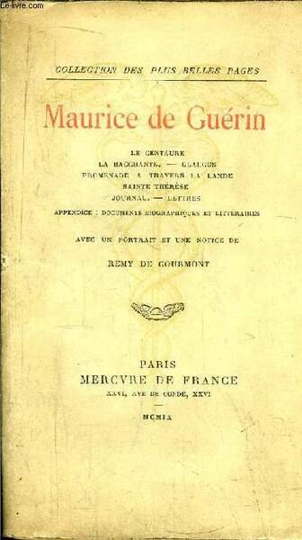 MAURICE DE GUERIN - COLLECTION DES PLUS BELLES PAGES/ Sommaire : Le centaure, la bacchante, Glaucus, Promenade � travers la lande, Saint th�r�se, Journal, Lettres - Appendice : Documents biopgraphiques et litt�raires- . | Libri antichi e moderni | De Guerin Maurice