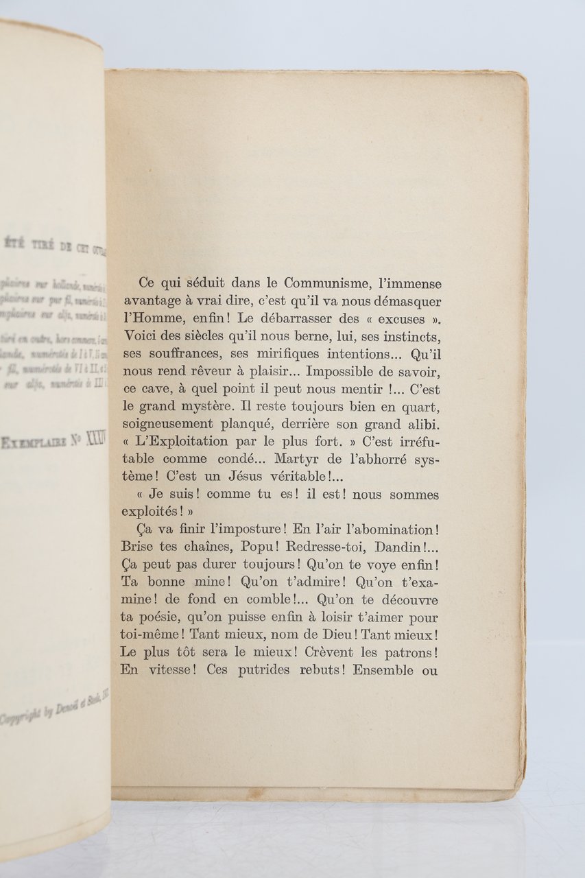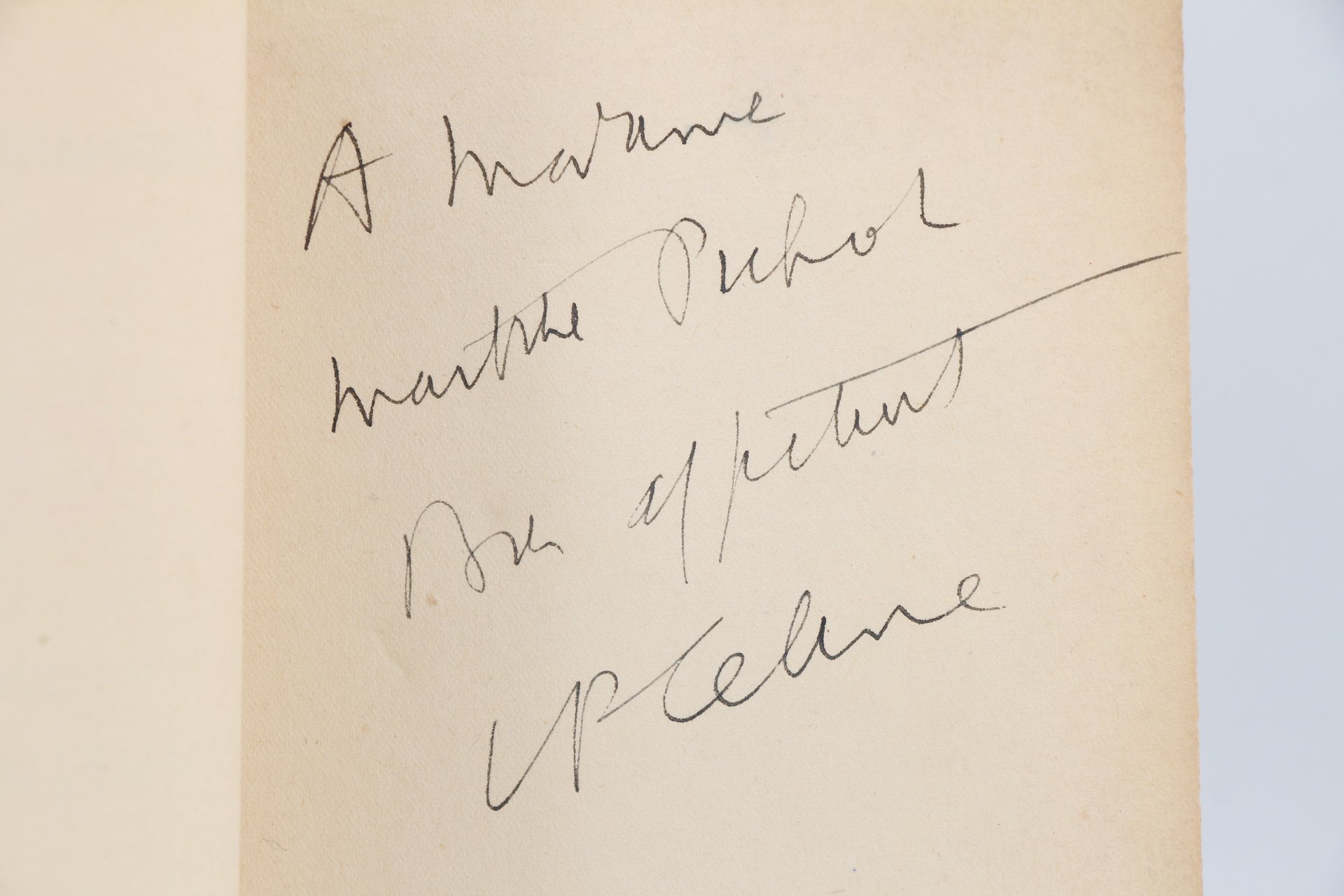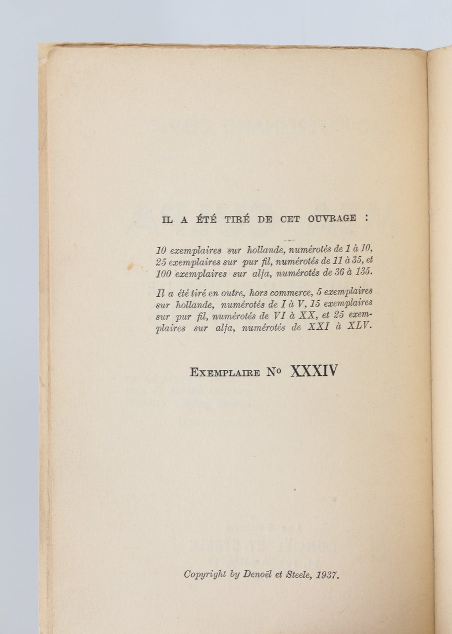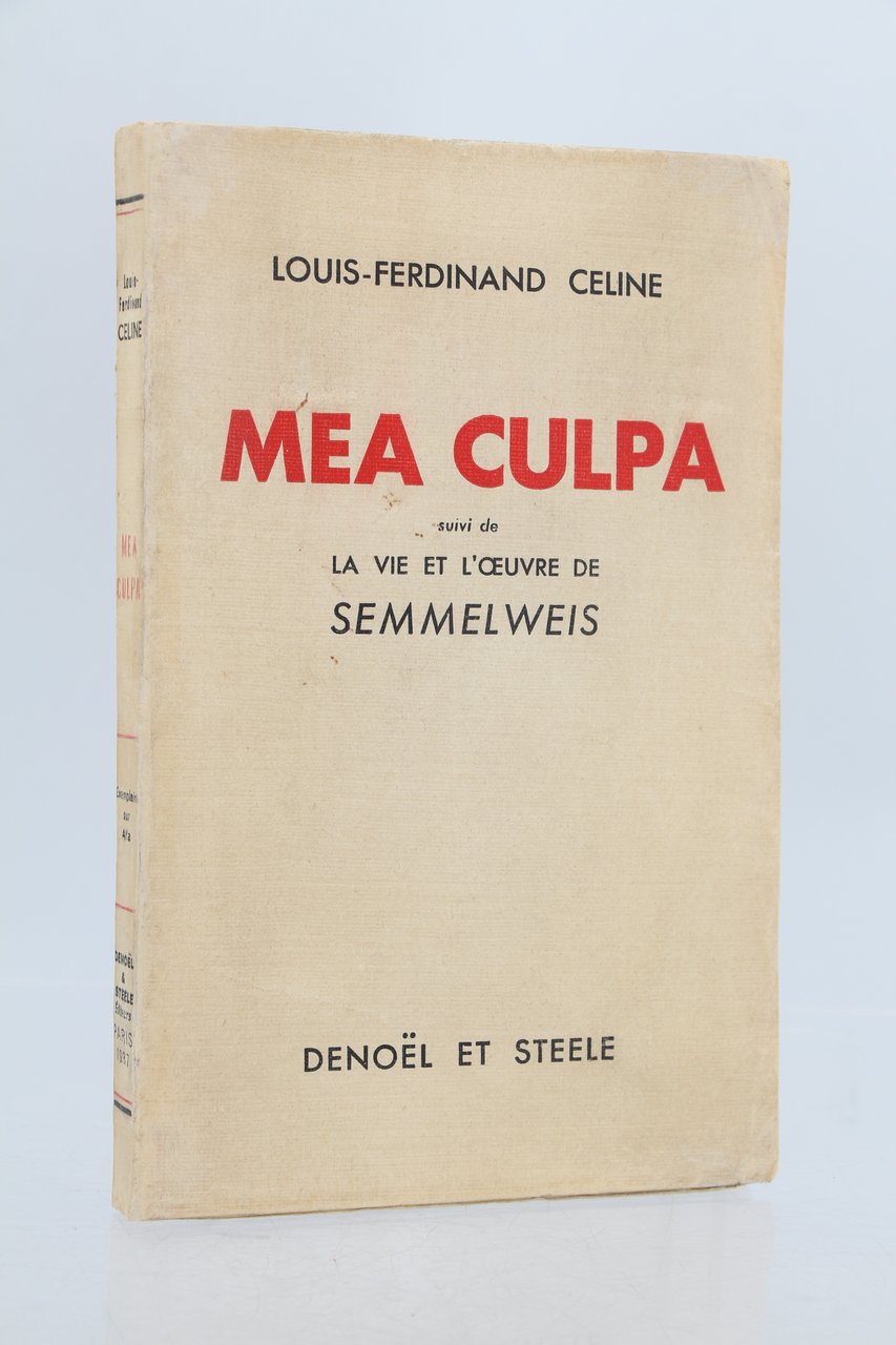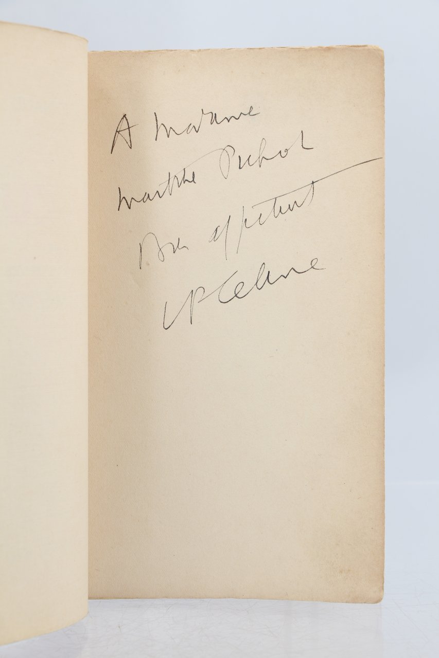 Denoël & Steele | Paris 1937 | 11.50 x 18.50 cm | broché | [ENGLISH DESCRIPTION ON DEMAND] | Edition originale, un des 125 exemplaires numérotés sur alfa, le nôtre un des 25 hors commerce, seuls grands papiers après 15 Hollande et 40 pur fil. Dos et marges des plats de couverture habilement restaurés. Envoi autographe signé de Louis-Ferdinand Céline A Madame Marthe Pujol Bien affectueusement L.F. Céline. Précieux exemplaire en grand papier enrichi d'un envoi autographe de l'auteur.