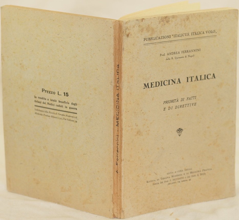 In 8. Dim. 23x16,5 cm. Pp. 174+(2). Edizione senza data ma degli anni '50 di questo volume di medicina scritto dal Prof. Andrea Ferrannini della Regia Università di Napoli. All'interno aggiornamenti su diverse materie: microscopia e biochimica, Biologia della procreazione, ginecologia e ostetricia, citologia, sangue, microbiologia, endocrinologia, oncologia, tubercolosi, infezione palustre, colerosa, rabbia, pneumococcica, tetanica, carbonchiosa, leishmaniosi, scarlattina, cuor, apparato repsiratorio e digerente, urologia, neurologia, elettrologia, oftalmologia, stomatologia, dermatologia, medicina legale, Croce rossa ec. In ottime condizioni. Copertina editoriale in ottime condizioni generali con lievi usure ai margini e dorso. Legatura in ottime condizioni. All'interno le pagine si presentano in ottime condizioni con rare fioriture. Not dated edition but of 1950's of this volume of medicine written by Prof. Andrea Ferrannini of the Regia Università di Napoli. Insie upgrades on different issues: microscope and biochemistry, Biology of procreation, ginecology and obstetrics, citology, blood, microbiology, endocrinology, oncology, tubercolosis, infezione palustre, cholera, rabbia, pneumococcica, tetan, carbonchio, leishmaniosi, scarlattina, heart, breathing and digestive system, urology, neurology, electrology, oftalmology, stomach, dermatology, legal medicine, Red Cross ec. In very good conditions. Editorial cover in very good general conditions slightly worn in the edges and spine. Binding in very good conditions. Inside pages are in very good conditions with occasional foxings.