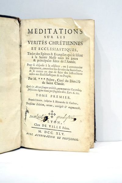 MEDITATIONS sur les verités chrétiennes et ecclésiastiques, tirées des Epîtres et Evangiles qui se lisent à la Sainte Messe tous les jours et principales Fêtes de l'année. Pour se disposer à la célébrer, ou à communier dignement, connoître les devoirs du Sacerdoce, et se mettre en état de faire des instructions utiles aux Ecclésiastiques et au Peuple. Par M*** prêtre, Curé du Diocèse de Saint Claude. Tome premier. Depuis l'Avent jusqu'au I dimanche de Carême. Troisième édition, revue, corrigée et augmentée.