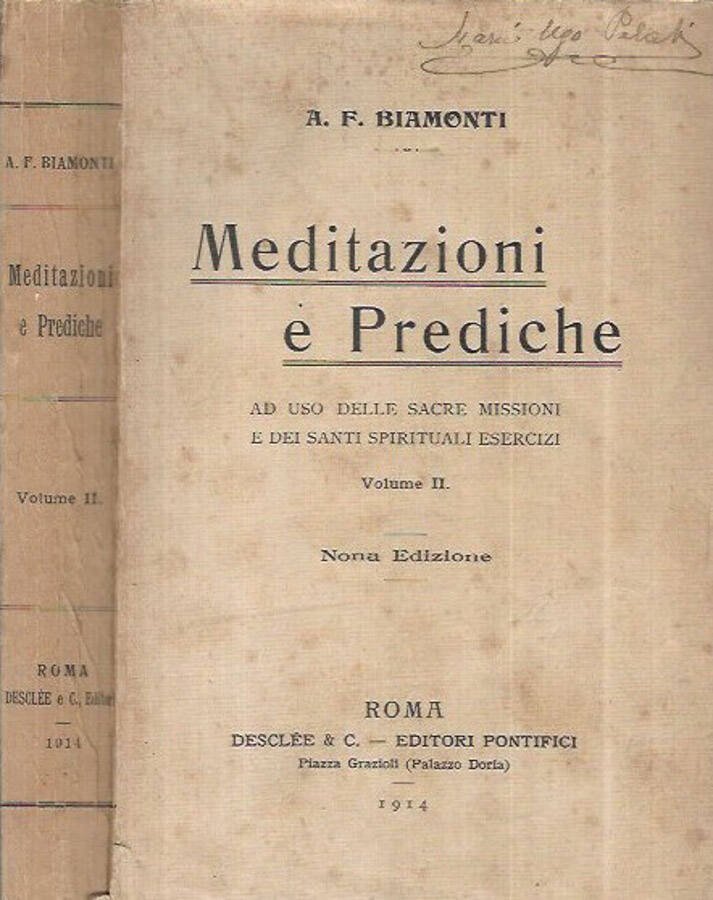 Opera incompleta, volume II, nona edizione delle Meditazioni e prediche ad uso delle Sacre missioni e dei Santi spirituali esercizi. Edizione del 1914 rilegata in brossura, in buono stato di conservazione, con firma di appartenenza in copertina e al frontespizio. Il dorso è piuttosto saldo, la legatura è stabile. All'interno le pagine sono dorate dal tempo, con taglio integro. numero pagine 306.
