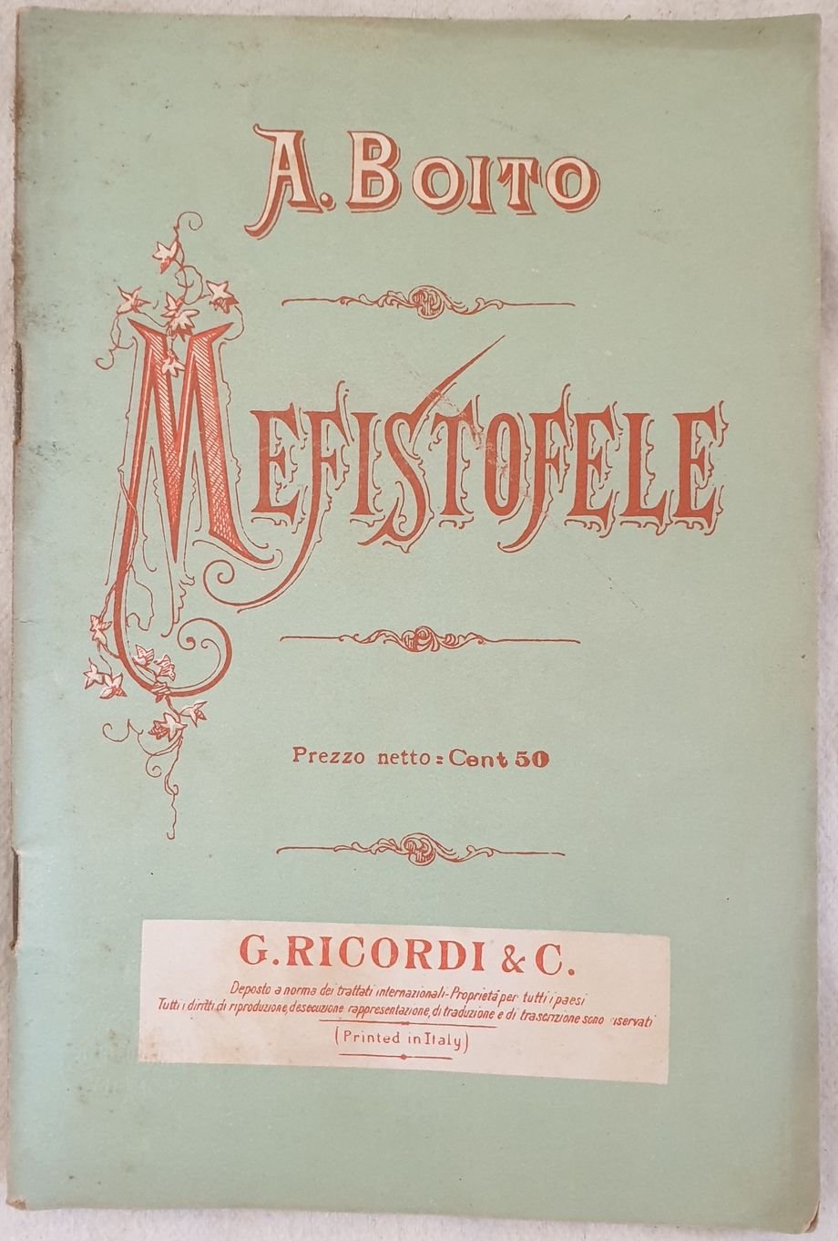 Edizione Ricordi di questo ibretto musicale dell'opera lirica "Mefistofele" di Arrigo Boito.<BR>La prima rappresentazione ebbe luogo il 5 marzo 1868. Timbro a secco datato novembre 1916. In ottime condizioni. Copertina editoriale in ottime condizioni con lievi usure marginali. Legatura in buone condizioni. Pagine in ottime condizioni con rare fioriture. In 16. Dim. 18,5x13,5 cm. Pp. 44.Ricordi edition of this booklet of the opera "Mefistofele" by Arrigo Boito. The first representation took place the 5th of march 1868. Embossed stamp dated november 1916 In very good conditions. Editorial cover in very good codnitions lightly worn in the extremities. Binding in good conditions. Inside pages are in very good conditions with occasional foxing. In 16. Dim. 18,5x13,5 cm. Pp. 44.