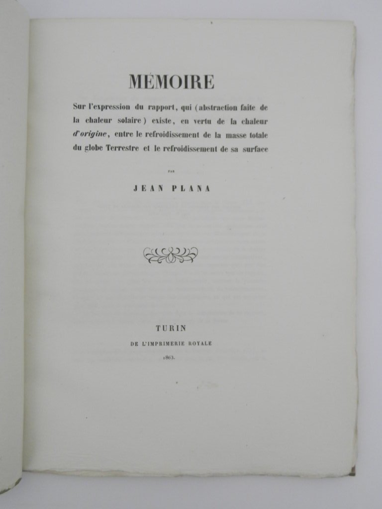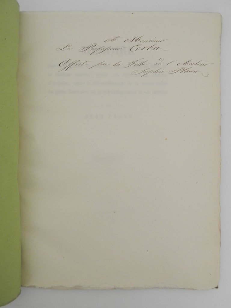 4°, pp. 80, brossura cartacea, esemplare in barbe con carte parzialmente intonse, bella copia. Dedica della figlia dell'autore, Sophie Plana, al professor Giuseppe Bartolomeo Erba (Domodossola, 1819 - Torino, 1895). Estratto da: Memorie della R. Accademia delle Scienze, ser. 2., v. 22. Giuseppe Bartolomeo Erba, venne aggregato alla classe di Matematica del Collegio di Scienze e Lettere dell'Università nel 1845, con una dissertazione che fu elogiata da Giovanni Plana. Così gli si aprì la via all'insegnamento universitario: nel 1850 fu nominato professore incaricato di Geometria descrittiva, nel 1851 ebbe la cattedra di Algebra e Geometria complementare all'Università di Torino; dal 1854 al 1857 sostituì Plana nel corso di Analisi infinitesimale, infine nel 1857 ottenne la cattedra di Meccanica razionale che conservò fino al 1891, anno in cui lasciò l'insegnamento. *** TUTTI I NOSTRI LIBRI SONO VISIBILI PREVIO CONTATTO MAIL O TELEFONO NELLA NUOVA SEDE DI MILANO: LIBRERIA COSMOPOLIS, VIA JOMMELLI, 22. ***