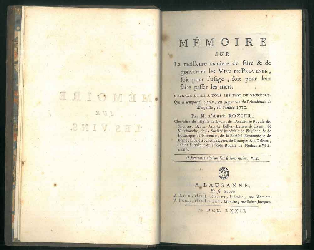 Mémoire sur la meilleure maniere de faire et de gouverner les vins, soit pour l'usage, soit pour leur faire passer les mers. Ouvrage utile à tous les pays de Vignoble. Qui a remporté le prix, au jugement de l'Académie de Marseille, en l'année 1770. Par M