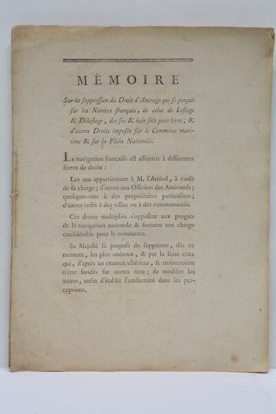 MÉMOIRE SUR LA SUPPRESSION DU DROIT D'ANCRAGE QUI SE PERÇOIT SUR LES NAVIRES FRANÇAIS, DE CELUI DE LESTAGE ET DÉLESTAGE, des six et huit sols pour livre, et d'autres Droits imposés sur le Commerce maritime et sur la Pêche Nationale.