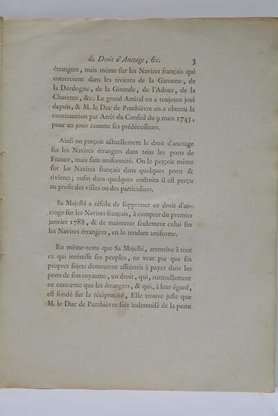 12 pages. (28x21 Cm). Broché. Rousseurs et mouillures éparses. Coin supérieur légèrement plié. Proposition de supprimer le droit d'ancrage sur les navires français à partir de janvier 1788 et de le maintenir sur les navires étrangers. Document en bon état.