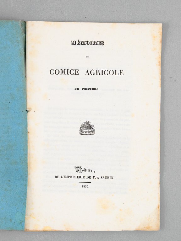 Mémoires du Comice Agricole de Poitiers : Origine, propagation et usages de la pomme de terre ; De la culture des récoltes vertes pour forrage temporaire d'été et pour engrais ; Sur le mode de tailler et soigner la vigne qu'il a mis avantageusement en pratique, et sur les procédés oenologiques qu'il a employés avec succès dans la confection du vin.