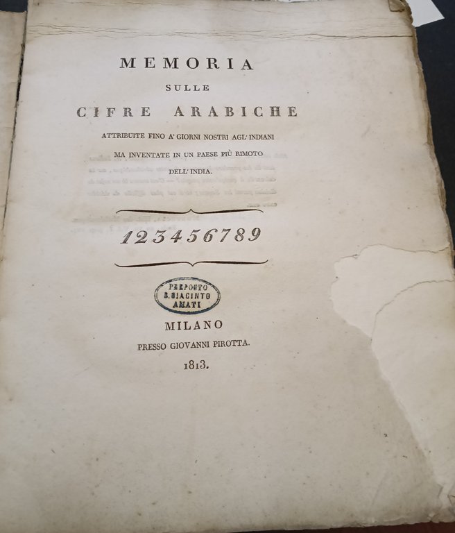 Memoria sulle cifre arabiche attribuite fino a' giorni nostri agl'indiani ma inventate in un paese più remoto dell'India