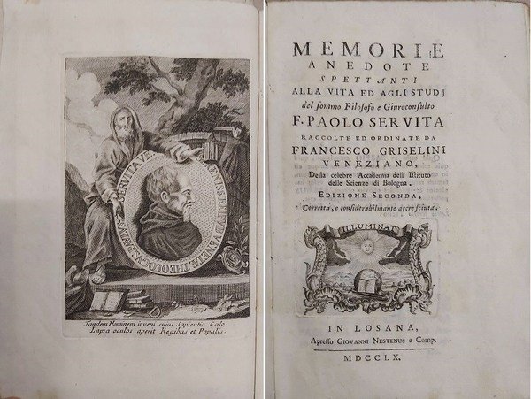 MEMORIE ANEDOTE spettanti alla vita ed agli studi del sommo filosofo e giureconsulto F. Paolo Servita. Raccolte ed ordinate da. veneziano della celebre Accademia dell’Istituto delle Scienze di Bologna. Edizione seconda, corretta ed considerabilmente accresciuta.
