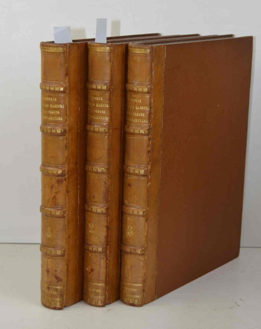 Tre volumi di cm. 27, pp. (12) xl (4) 215 (3); (12) 225 (3); (8) 249 (1). Con stemmi ai frontespizi, molte vignette, medaglie e decorazioni tipografiche nel testo e 3 tavole geografiche f.t. (di cui una ripiegata). Solida legatura ottocentesca in mezza pelle, dorsi a nervi con titoli e fregi in oro. Appena qualche piccola screpolatura alle cerniere, peraltro esemplare pulito ed in ottimo stato di conservazione. Edizione bodoniana di grande eleganza, stampata verosimilmente in un numero limitato di copie, rendendola oggi assai rara. Cfr. Brooks (155): "Bel libro..." senza pero citare la carta geografica di Gerusalemme presente nel primo volume.