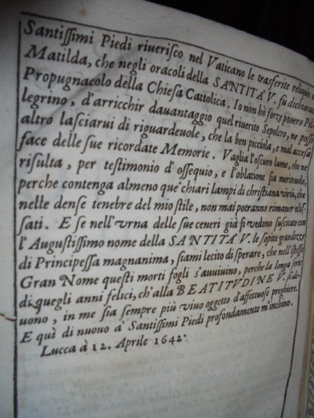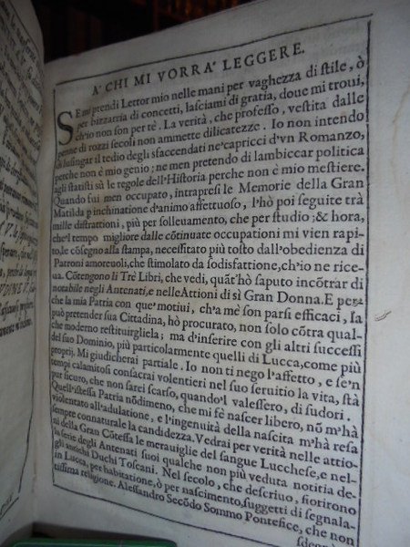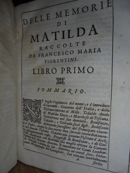 Fiorentini, Francesco Maria. Lucca, Pellegrino Bidelli, 1642. Memorie di Matilda la gran Contessa, propugnacolo della Chiesa, con le particolari notizie della sua vita e con l' antica serie degli antenati, da F.M.F. restituita all' origine della Patria Lucchese. In - 4°, cartone coevo. (8), 355, (1), 170, (17) pp. Testo inquadrato con postille. Manca l' antiporta. Minuscoli forellini di tarlo alle prime e ultime pagine peraltro bell' esemplare di quest' opera rara. Manzoni, Bibl. stor. municipale, I, p. 355. Lozzi, 2390. Bibl. Platneriana. p. 85. Neg. Mob. 4