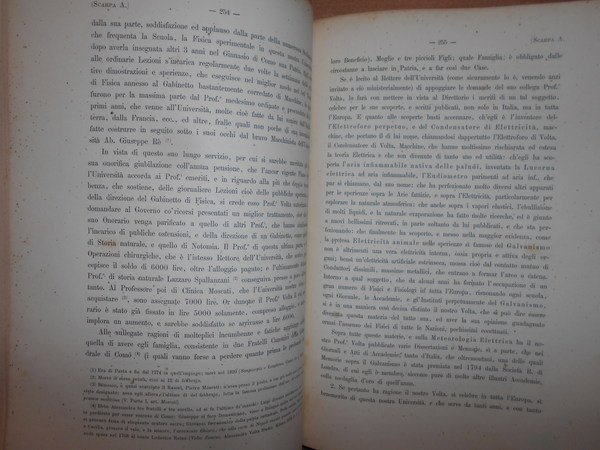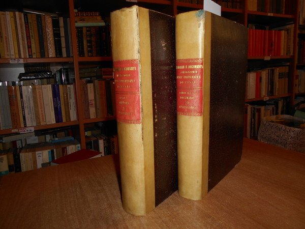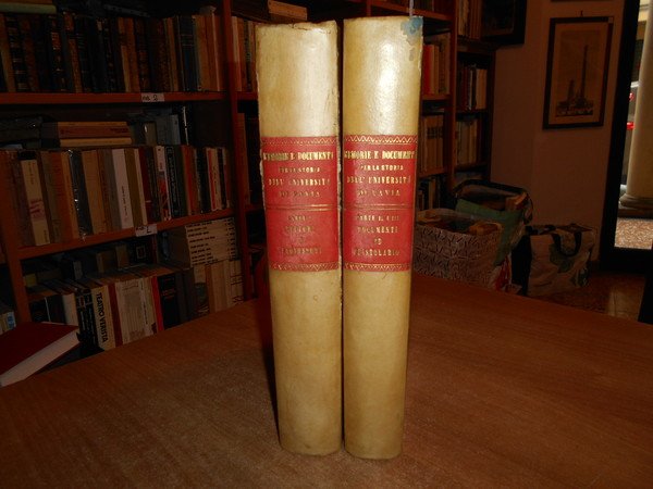 AA.VV. Pavia, Stabilimento Librario Successori Bizzoni, 1877 - 1878. MEMORIE E DOCUMENTI per la Storia dell' Università di Pavia e degli uomini che v' insegnarono. 3 parti in due volumi in-4° grande, m. pergamena coeva con titoli in oro entro tasselli ai dorsi, copertine originali conservate. VIII, 618; IX, 474 pp.