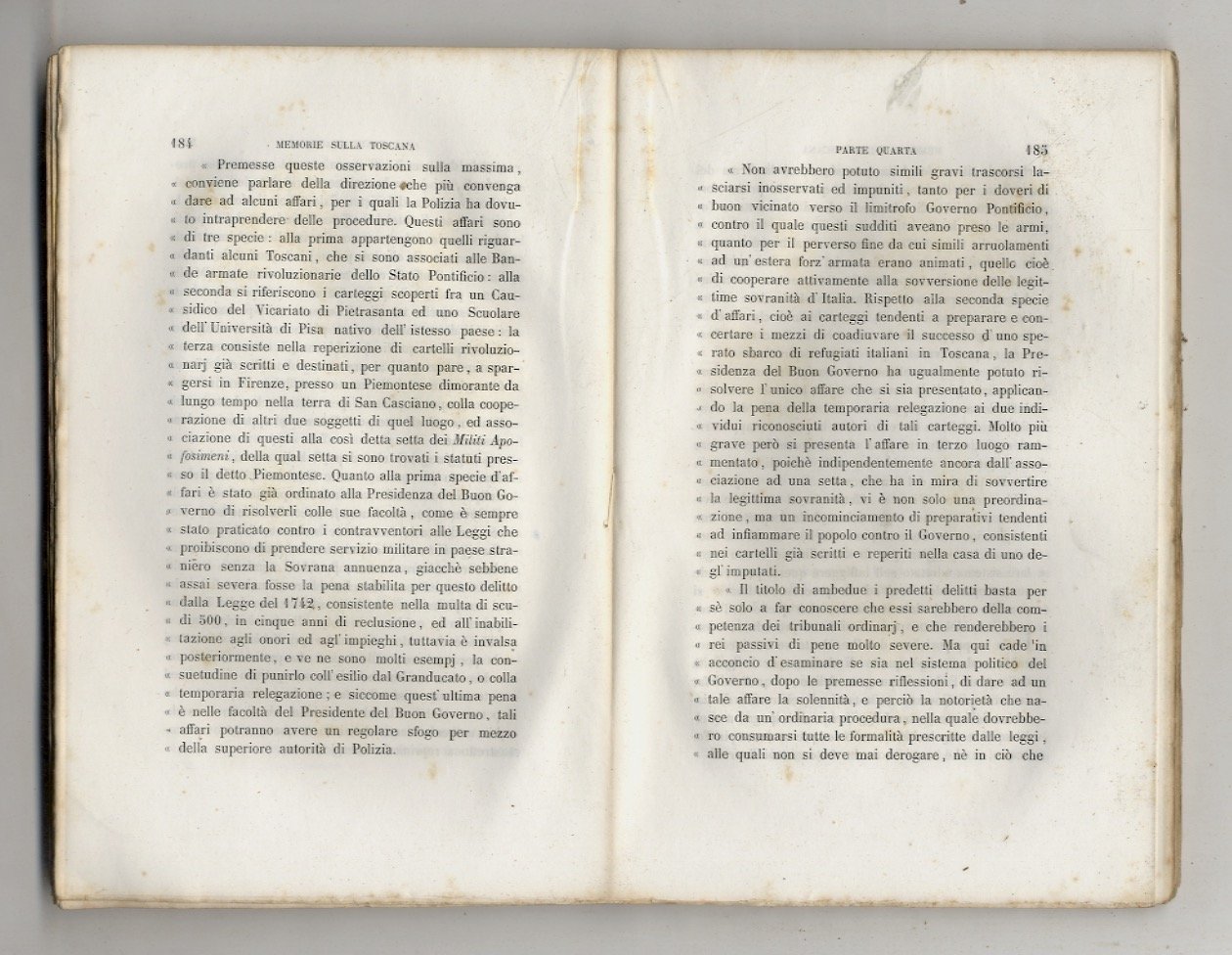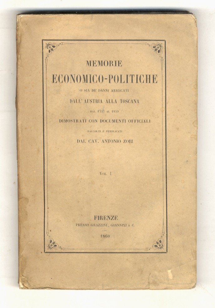 Firenze, presso Grazzini, Giannini e C., 1860, in-8, br. editoriale con cornice tipografica ed angolari alla coperta anteriore, pp. 320. Dorso diviso, con mancanze, privo della coperta posteriore. Manca il volume II dal titolo: "Sommario di documenti ufficiali a dimostrazione delle Memorie economico-politiche (.)".