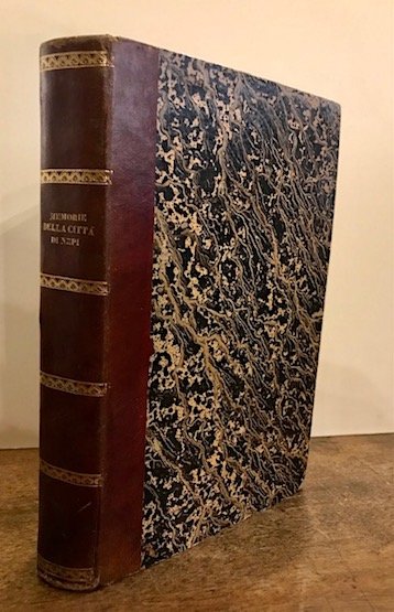 8vo (cm. 22,7), 311(1) pp., 2 cc.nn.; 202 pp., 3 cc.nn. Con 11 tavv. f.t. in fine (di cui 5 ripiegate). Le tavv. III e IV sono su un’unica carta. Legatura coeva in mz. pelle con fili e titolo impressi in oro al ds. Esemplare in ottimo stato di conservazione. In questi due rari saggi monografici, l’Autore (1791-1869) dopo aver esaminato le origini di Nepi, l’età romana e quella cristiana, tratta dell’ingresso nei domini della Chiesa, degli statuti medievali, dell’arrivo dei Farnese, dei Governatori della città, delle devastazioni dei Francesi, delle istituzioni ecclesiastiche presenti, della Diocesi di Nepi e dei cittadini illustri della città. Analizza poi il territorio circostante, la Valle Sub-Pentonia e le città che un tempo furono soggette a Nepi e quindi Gallese, Civita Castellana, Sutri, Orte.