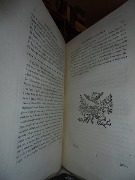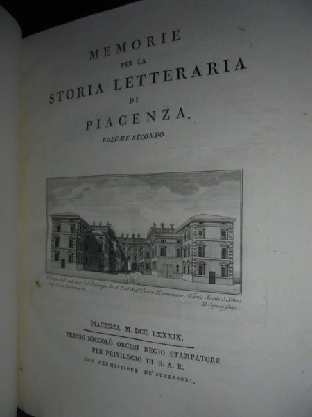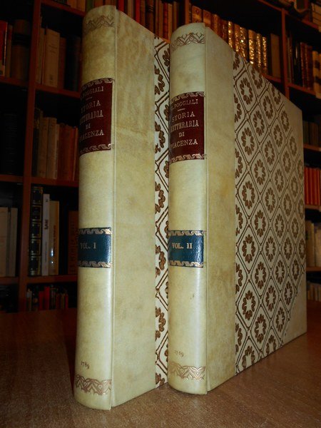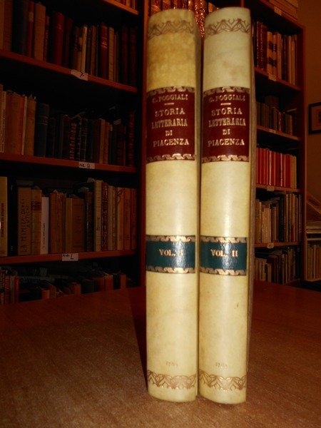 Poggiali, Cristoforo. Piacenza, presso Niccolò Orcesi, 1789. Memorie per la storia letteraria di Piacenza. 2 volumi in-4°, m. pergamena coeva con grandi angoli. (ii), xx, 295, (1) pp.; (ii), 250, (2) pp. con due diverse vignette incise in rame ai frontespizi. Opera classica che prende in esame la letteratura ed i letterati piacentini, stilata dal bibliotecario e poligrafo Poggiali. Bellissimo esemplare impresso su carta forte. Cas.