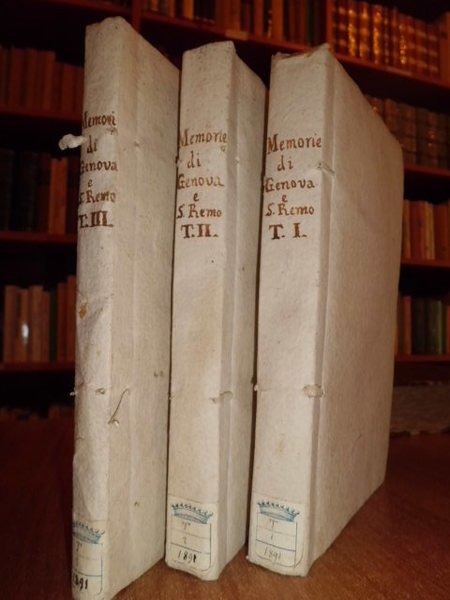 (Montagnini, Carlo Ign.). Ratisbona (Firenze), Giuseppe Allegrini, 1769. Memorie riguardanti la superiorità imperiale sopra la città di Genova e di S. Remo, come pure sopra tutta la Liguria. 3 volumi in - 8°, cartone coevo officinale, intonsi. viii, 254; xxxii, 290; viii, 150 pp. Bellissimo esemplare. Melzi, II, p. 186: << Fu autore di queste Memorie l' abate Montagnini; né è vero che siano state originalmente tradotte dal francese.>> Manca al Lozzi e alla Bibl. Platneriana. Uff. mob. 2.