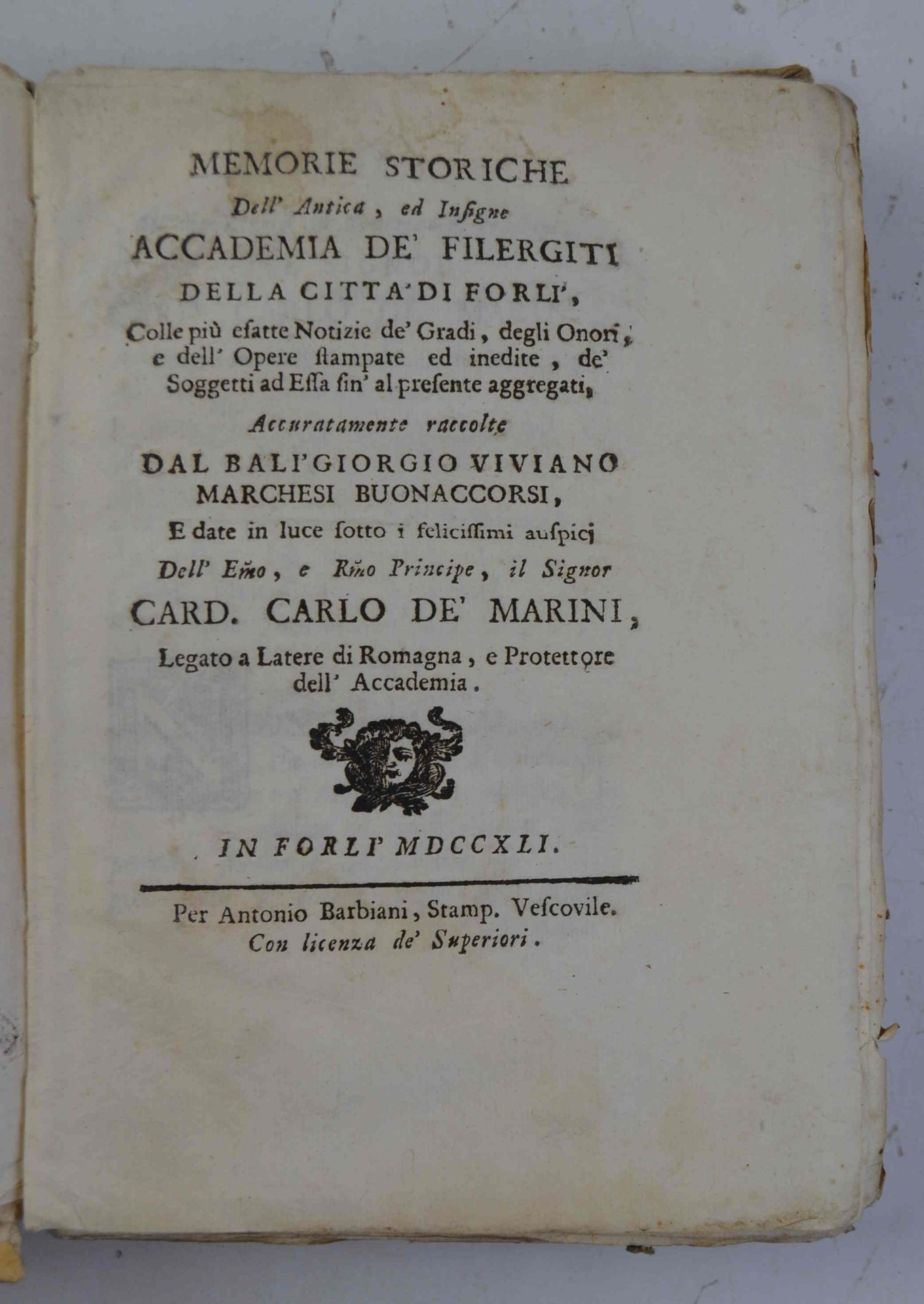 Cm. 22, pp. (8) viii, 459 (1). Legatura coeva in cart. alla rustica. Dorso interamente mancante, peraltro esemplare marginoso, genuino e ben conservato. Mancano due carte fra le preliminari che contengono "La protesta dell'Autore". Edizione originale ed unica, piuttosto rara di quest'opera che rappresenta il primo, ed unico nell'antichità, studio sulla Accademia forlivese dei Filergiti.