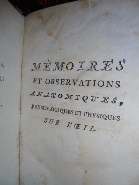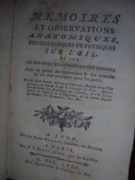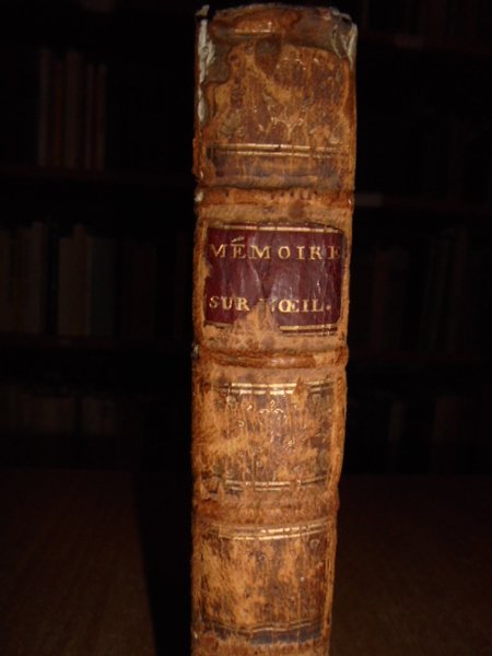 (Oculistica). Janin, Jean. Lyon, Frères Perisse et Paris, P.F. Didot, 1772. Mémories et observations anatomiques, physiologiques et physiques sur l' oeil, et sur les maladies qui affectent cet organe; avec un précis des opérations et des remedes qu' on doit pratiquer pour les guérir. In - 8°, piena pelle coeva (un pò logora). XL, 474, (6) pp. Manca l' occhietto, peraltro ben conservato. Edizione originale. Hirsch, III, p. 418. Waller, 5116. Wellcome, III, p. 345. Becker, Collection, 208. Source book of ophthalmology, 1181: << A collection which the author to have been a skilled surgeon and careful observer; also contains the first published account of hypermetropia and the first experiment using glasses of complimentary colors before both eyes >>. Uff. mob. 2