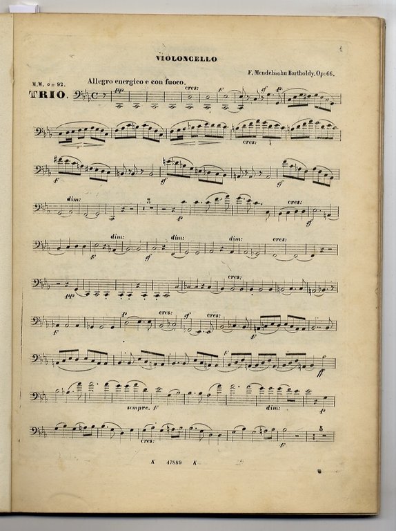 MENDELSSOHN BARTHOLDY Felix, Piano Trio Op. 66, pp. 12. (Composto nel 1845 ed eseguito per la 1a volta nello stesso anno alla Gewandhaus di Lipsia ove Mendelssohn era direttore; edito a Lipsia da Breitkopf e Härtel nel 1846). (Segue:) ECKERT Karl Anton, Trio für pianoforte, violine und violoncell, Op. 18. Leipzig, Breitkopf & Härtel, (1845?), pp. 8. (Dedicato a Mendelssohn). (Segue:) PIXIS Johann Peter, 6ème Grand Trio pour pianoforte, violon et violoncello. Oeuvre 139. Leipzig, F. Hofmeister, (1839), pp. 9. (Dedicato a Clara Wieck Schumann). (Segue:) MARSCHNER Heinrich August, Grand Trio pour piano, violon et violoncelle, Op. 111. Leipzig, F. Hofmeister (1842), pp. 12. (Dedicato a Sophie Cohen née Gleisdorffer). & Ibidem, Grand Trio pour