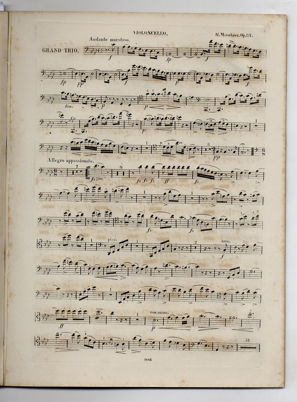 s.l. (Leipzig), s.n.t. (Breitkopf & Härtel, F. Hofmeister), s.d. (prima metà del secolo XIX), in-4, cartoncino marmorizzato coevo con titolo manoscritto in matita su etichetta applicata al piatto anteriore. Raccolta di 5 spartiti con musica incisa (parti per solo violoncello; prive quindi del frontespizio della partitura completa; le indicazioni sono desunte dai nn.i di lastra per la musica a stampa, che sono: K 17889, 7256, 2409, 2645, 2895). Sono tutti trii per violino, violoncello e pianoforte di compositori tedeschi d'epoca romantica, in edizione originale o coeva di pochi anni. Ottime condizioni.
