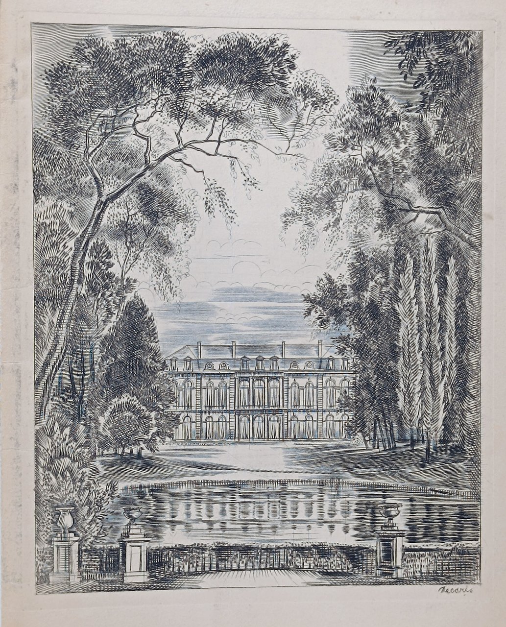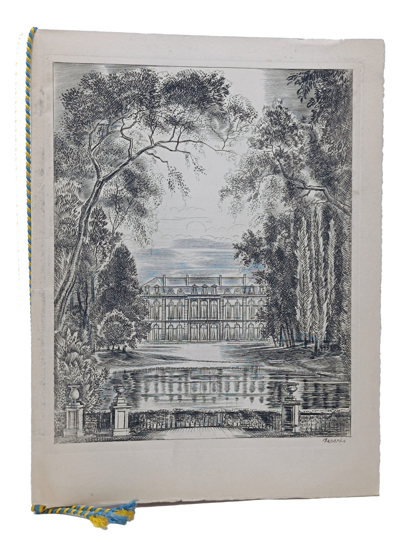 Copertina flessibile su carta spessa con una bella incisione originale, sul piatto anteriore, firmata in lastra dal celebre incisore francese Albert Decaris (1901 - 1988) raffigurante la facciata del Palazzo dell'Eliseo, sede del presidente della Repubblica del tempo, Charles Degaulle. Il Menù fa riferimento alla cena organizzata il 28 maggio 1963 in onore del re (Gustave VI Adolphe) e della regina (Louise) di Svezia in visita ufficiale in Francia. Il menù è composto da 4 pagine interne due delle quali con testo stampato. Il primo dei due fogli stampati è una sorta di frontespizio sul quale è riportato l'oggetto, la sede (Palais de l'Elysée) e la data (28 mai 1963) della serata. La seconda pagina è lasciata bianca mentre sulla terza è proposto (stampato) il menù della serata con le portate e i vini. Le pagine interne sono unite alla copertina tramite un apposito ed elegante cordoncino in doppio colore: blu e giallo (i colori della bandiera svedese). Formato del menù: 19 x 25 cm circa. La battuta dell'incisione realizzata da Decaris misura 17 x 21 cm circa. Stato di conservazione: in passato, il menù, è stato piegato verticalmente in due e presenta la linea di piegatura (sulla copertina e sulle pagine interne), qualche macchia sulla copertina posteriore ma, nel complesso, buono. ATTENZIONE: nell'immagine riportata sembra che sull'incisione di Decaris vi sia del colore azzurro sulle linee del cielo ma è solo un 'difetto' della fotografia da noi realizzata (causato dalla luce). In realtà l'incisione è completamente in bianco e nero. Oggetto da collezione di estrema rarità sia come documento storico, sia per la magnifica incisione di uno dei grandi illustratori dell'epoca.