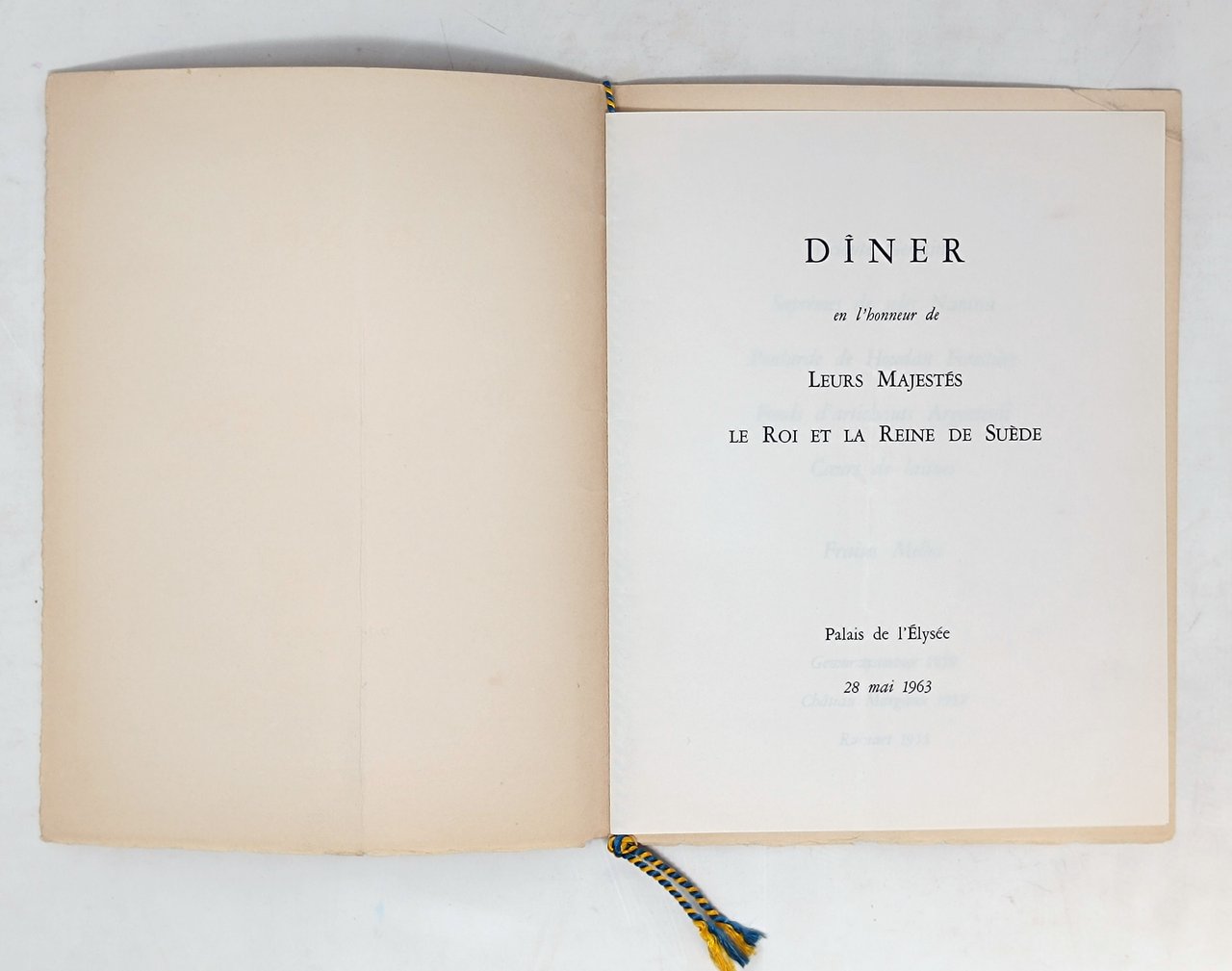 MENù Diner en l'honeur de Leurs Majestés Le Roi et la Reine de Suède PALAIS DE L'ELYSEE 28 mai 1963