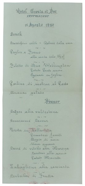 MENU MANOSCRITTO SU CARTA USO PERGAMENA - Courmayeur, Hotel Cresta et Roc, 15 Agosto 1980.