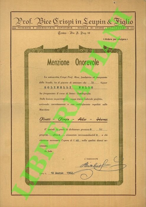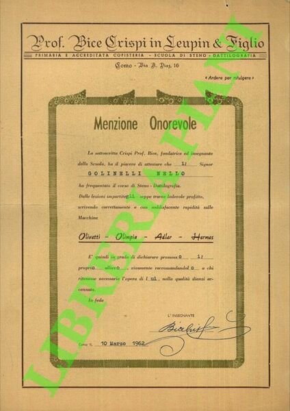 Menzione Onorevole, Steno - Dattilografia sulle Macchine Olivetti - Olimpia - Adler - Hermes.