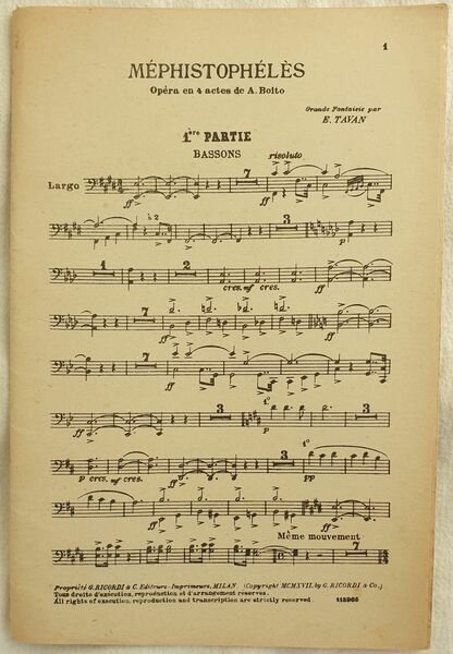 Partitura per orchestra del 1917 della melodia "Mephistopheles" di Tavan.<BR>Copertina assente. GENERE: Fantasia STRUMENTI: basso, flauto, tamburo ANNO: 1917 DIMENSIONI: In 8. cm 27x18 PAGINE: pp. 20 CONDIZIONI: Otime condizioni. Ex libris in copertinaScore for orchestra of 1917 of the melody Mephistopheles" by Tavan. Editorial cover lacks. MUSIC: Fantasy STRUMENTI: bass, flute drums YEAR: 1917 SIZE: In 8. cm 27x18 PAGES: pp. 20 Ex libris in the cover